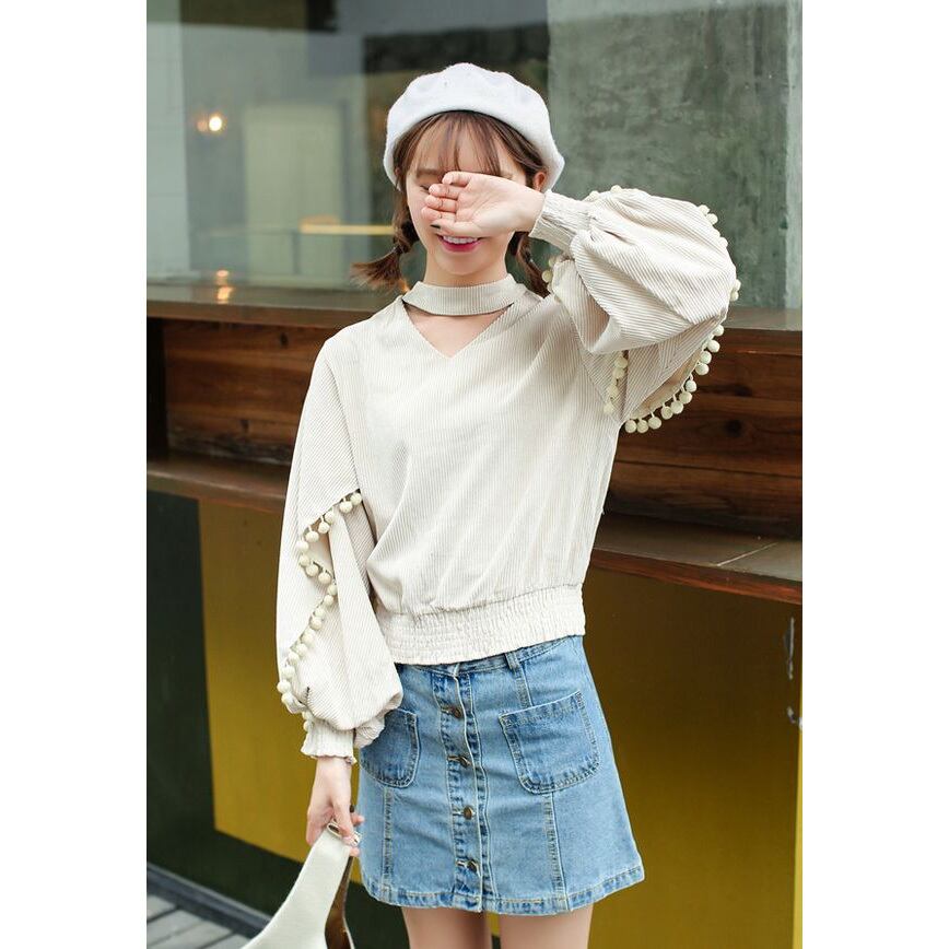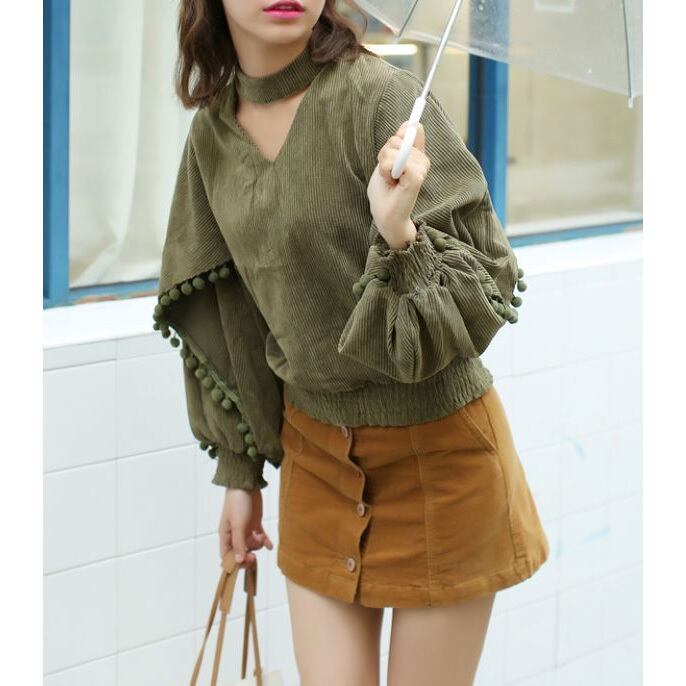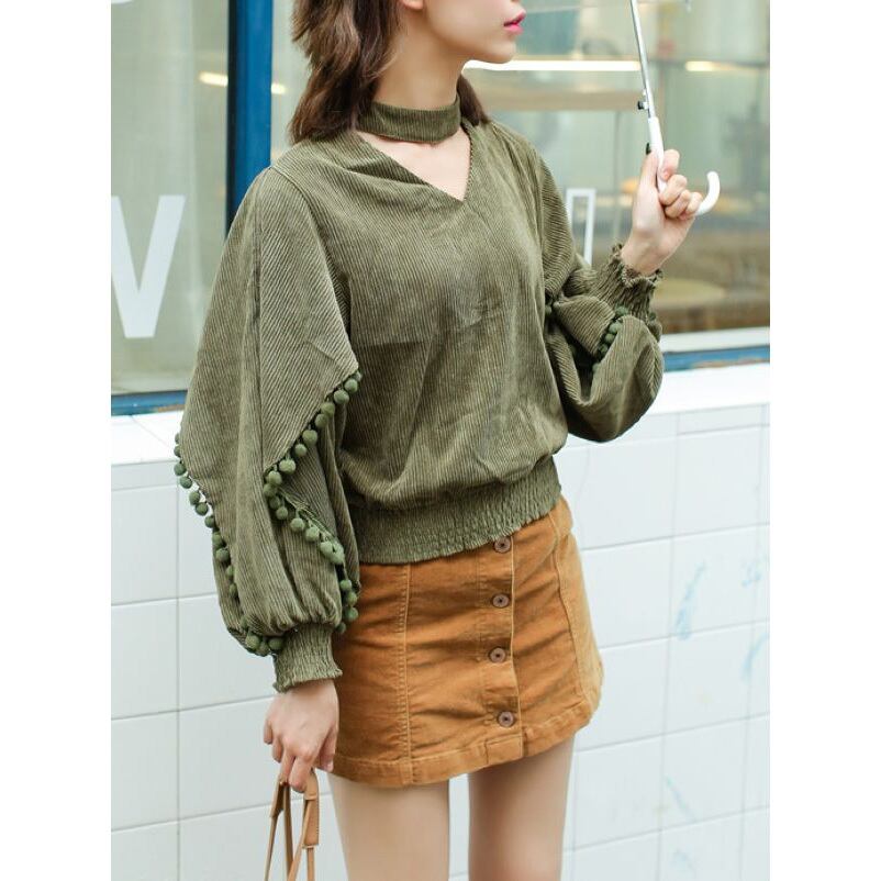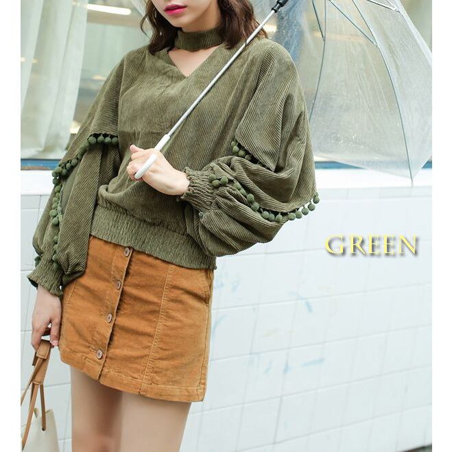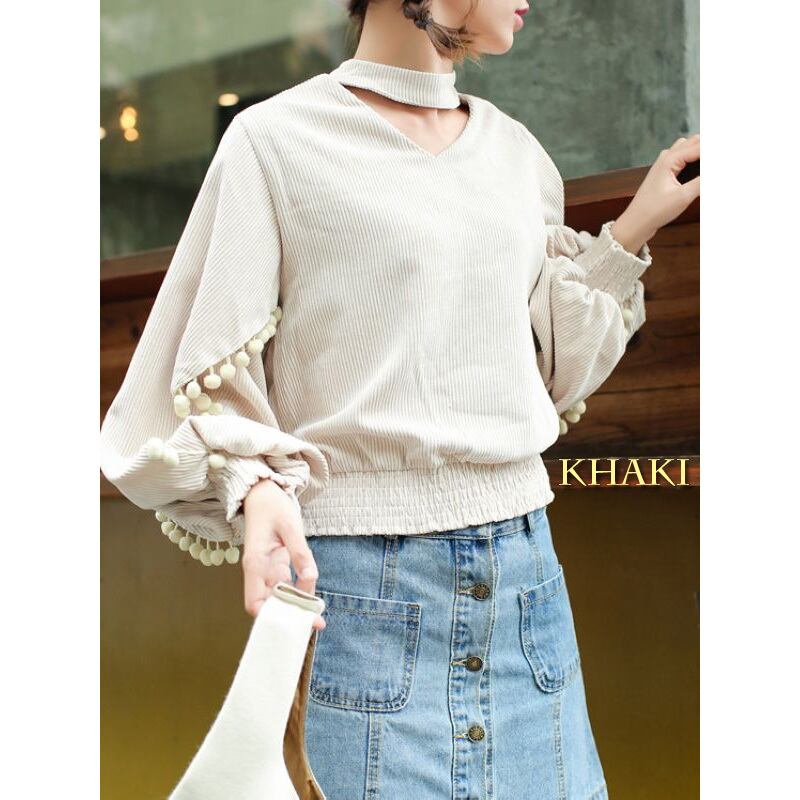 ★ポンポン付きワイド袖♪チョーカー風Vネックトップス全2色★