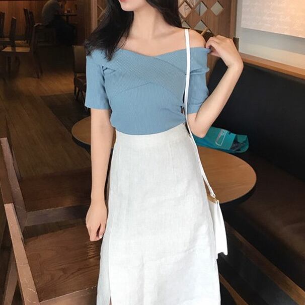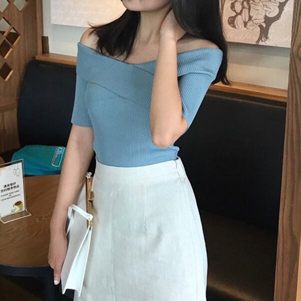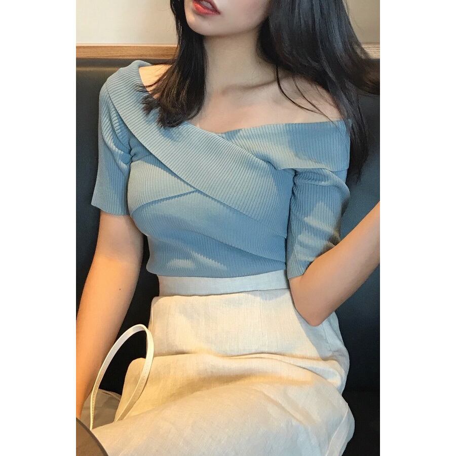 ★胸元クロス2WAYオフショル♪寒色カラー薄手ニットトップス★