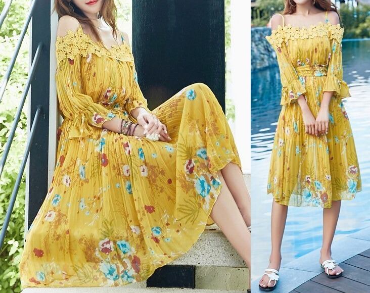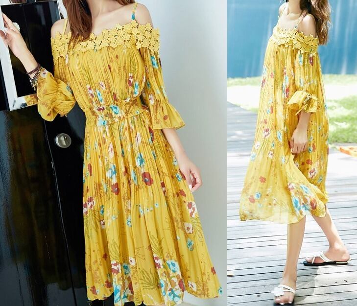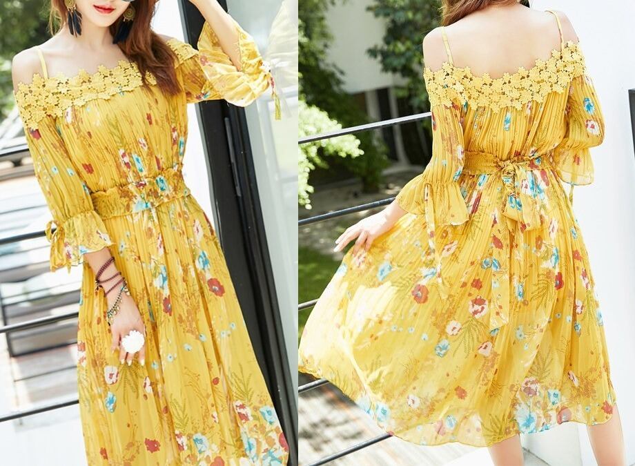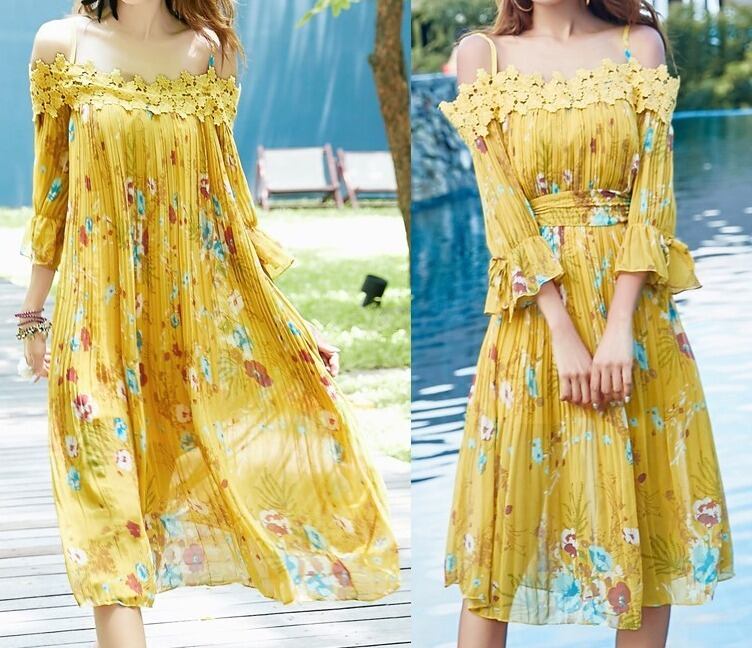 花柄★プリーツ★フレア・七分袖★バックリボン★ワンピース♪