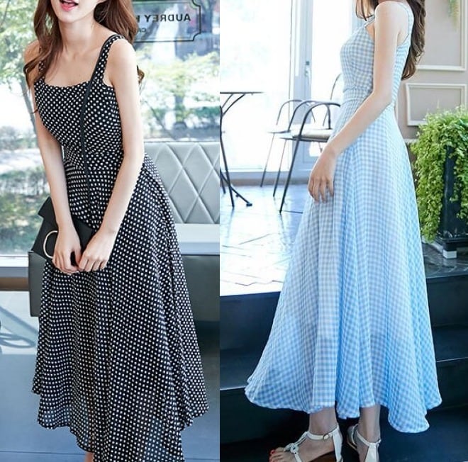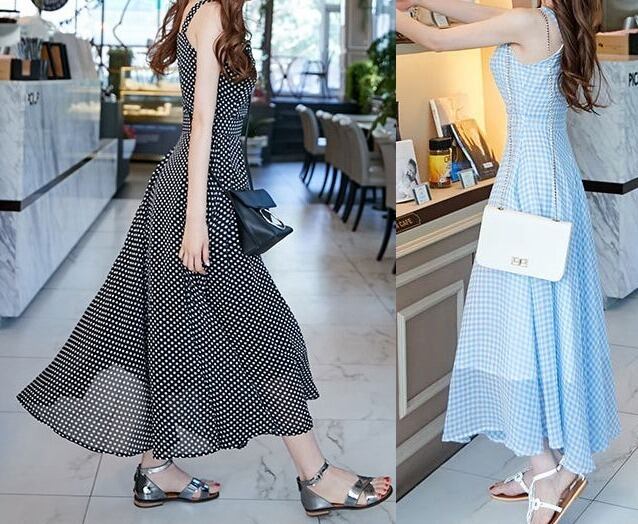ギンガムチェック&ドット柄★肩ストラップ★ロングワンピース♪