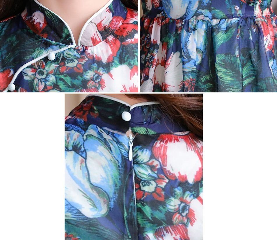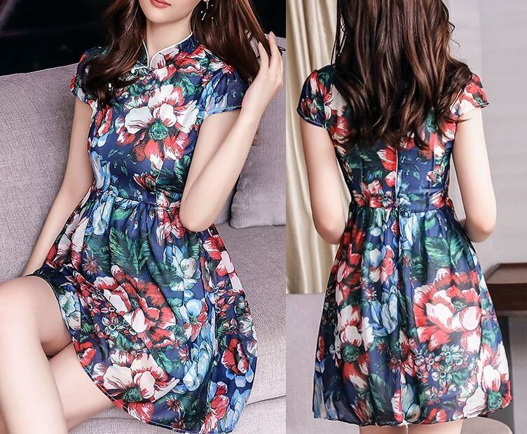 花柄デザイン★マオカラー★半袖★フレア★ミニ・ワンピース♪
