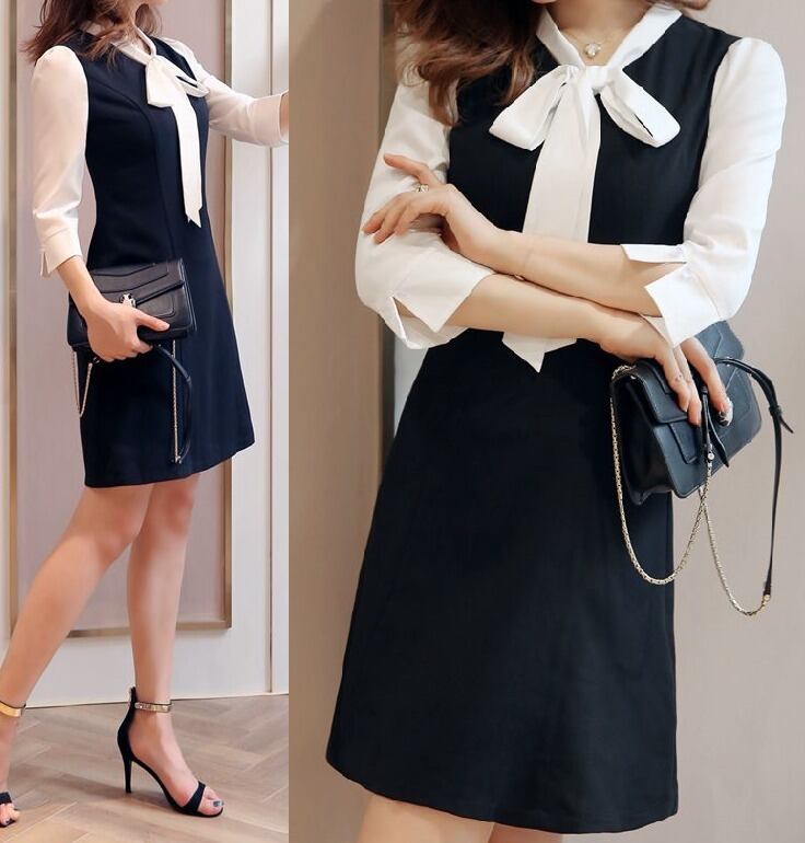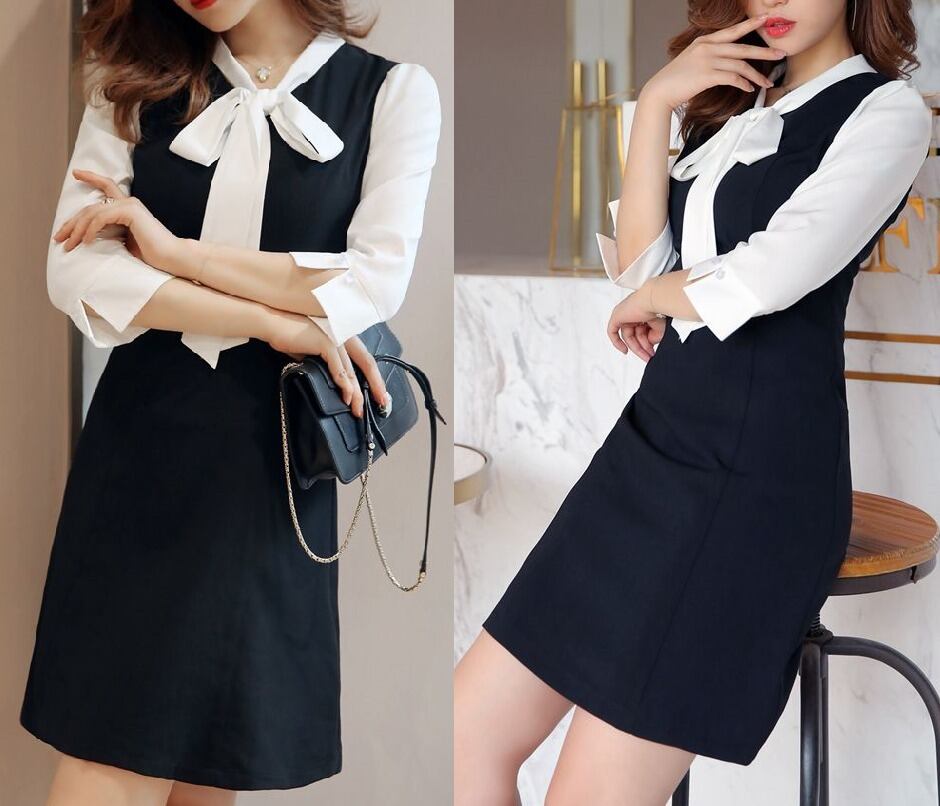 結びリボン★バイカラー★七分袖★タイト★ミニ・ワンピース♪