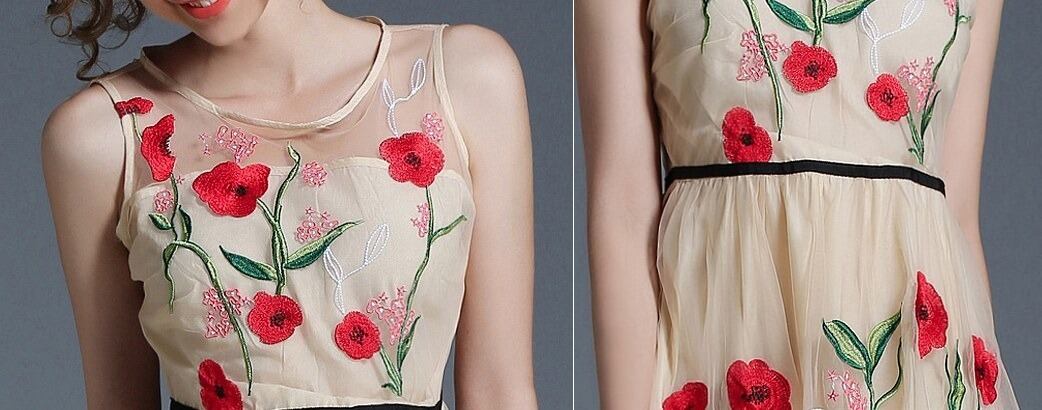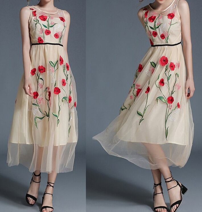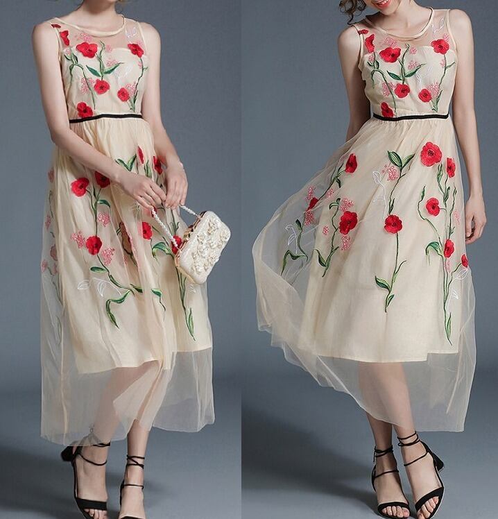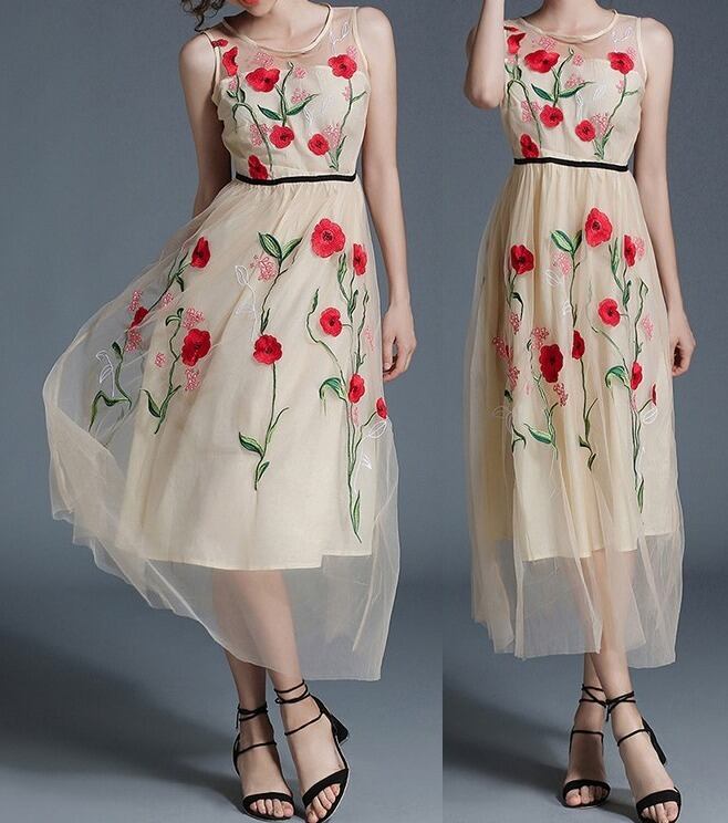 花柄刺繍★シースルー★ノースリーブ★フレア・ワンピース♪