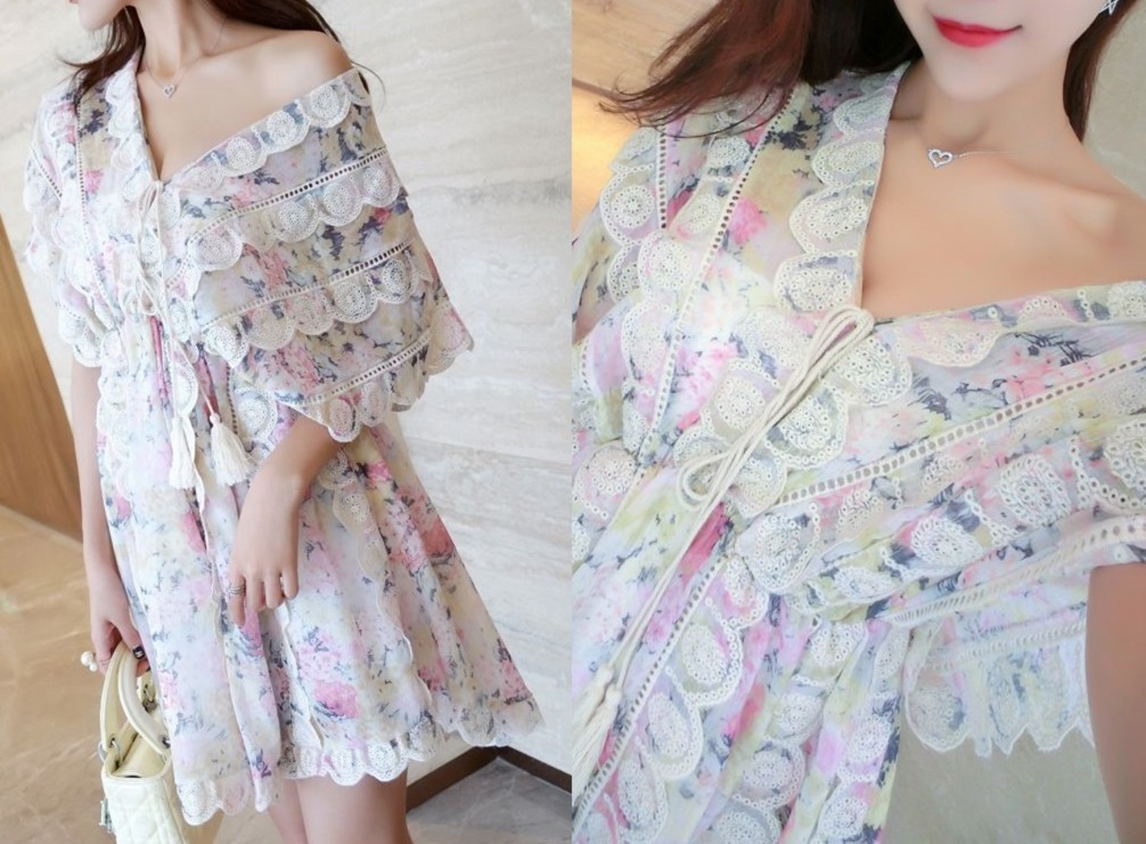 花柄プリント★結びリボン★フリルレース★ミニ・ワンピース♪