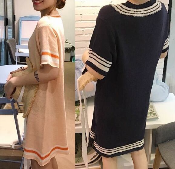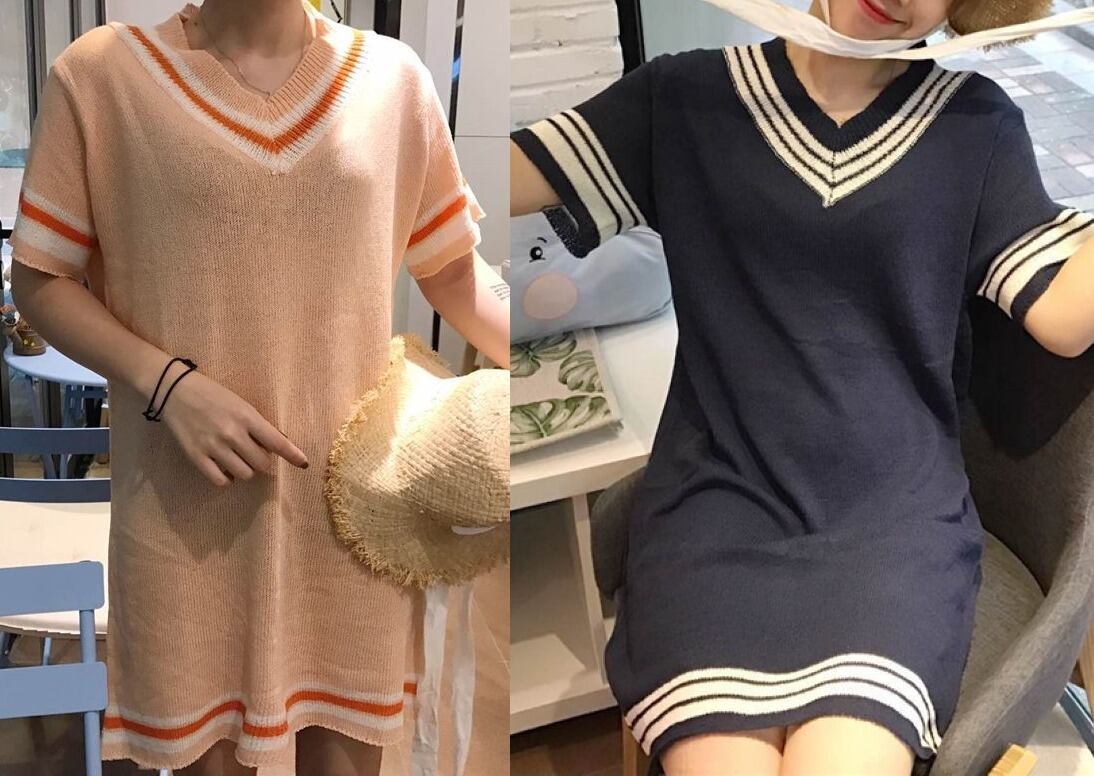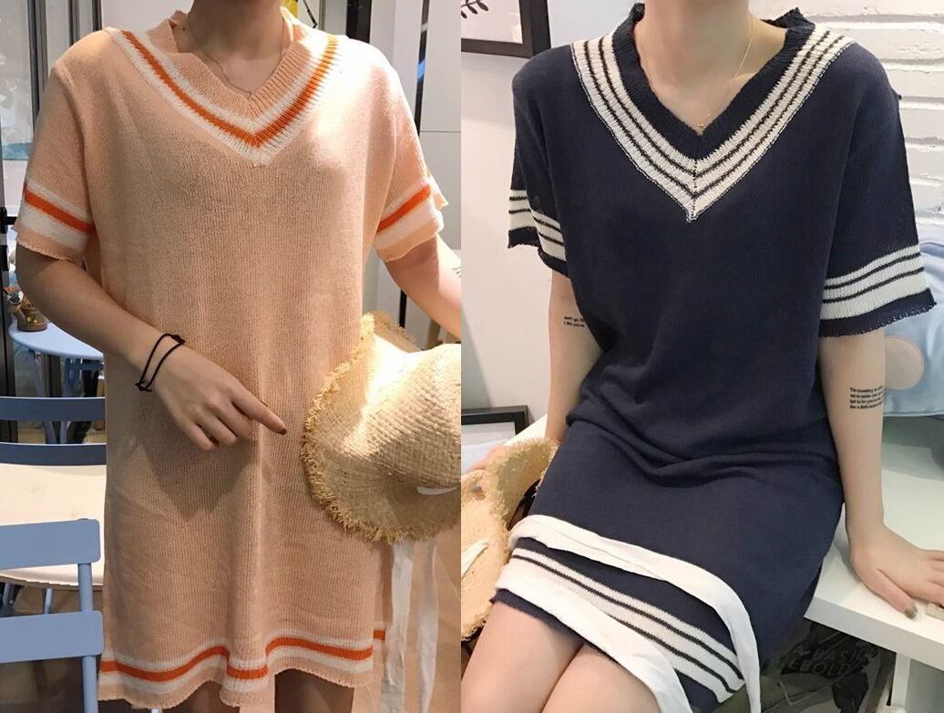 ストライプライン・デザイン★Vネック★半袖★ミニワンピース♪