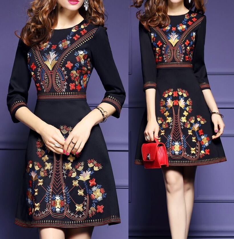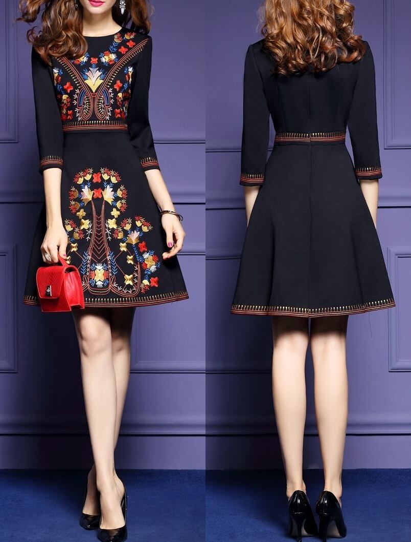 花柄・エレガント刺繍★ラウンドネック★七分袖★ワンピース♪