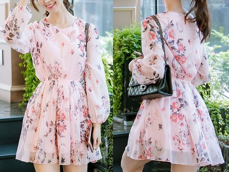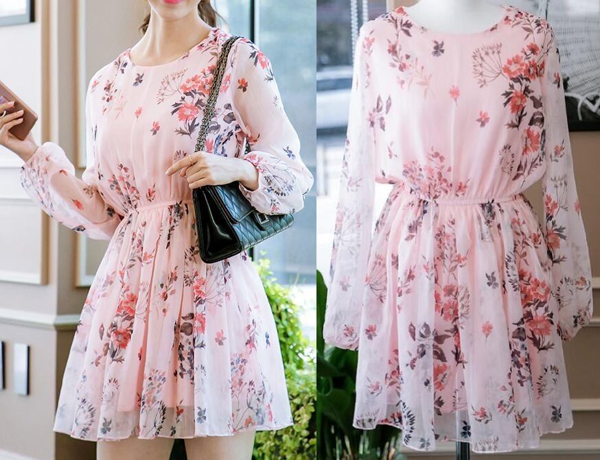 花柄★ギャザーウエスト★ラウンドネック★長袖★ワンピース♪