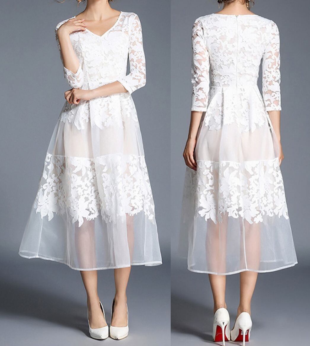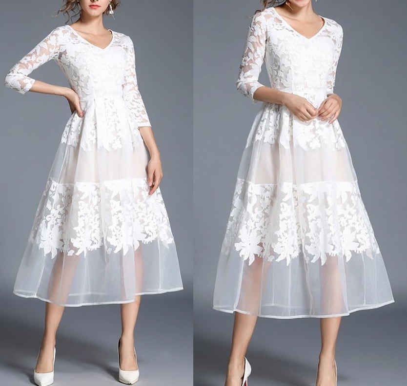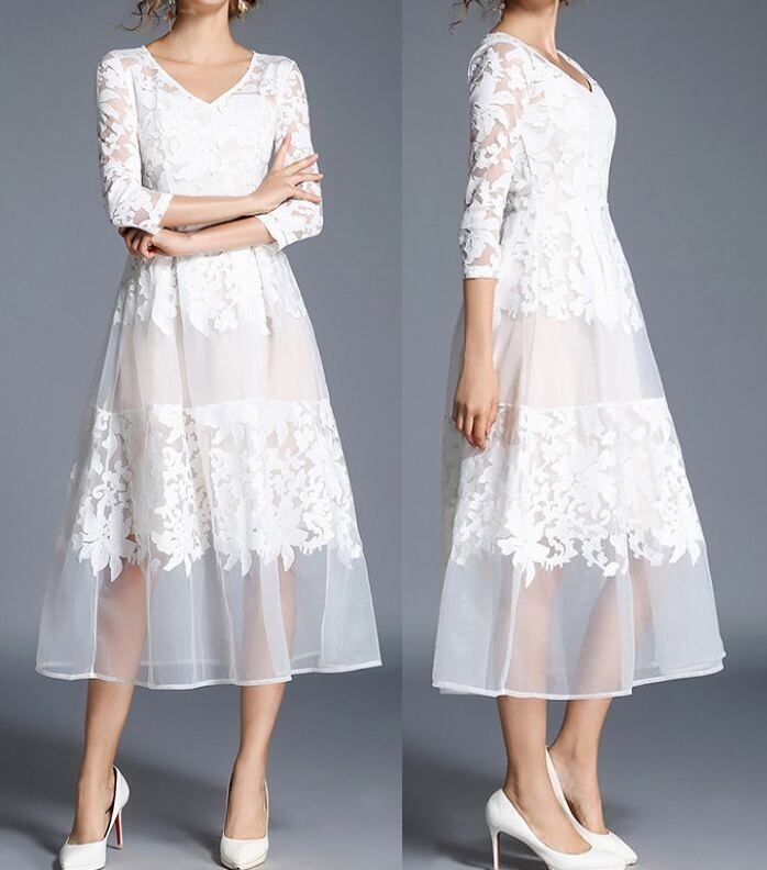 レース★シースルー★Vネック★七分袖★フレア★ワンピース♪