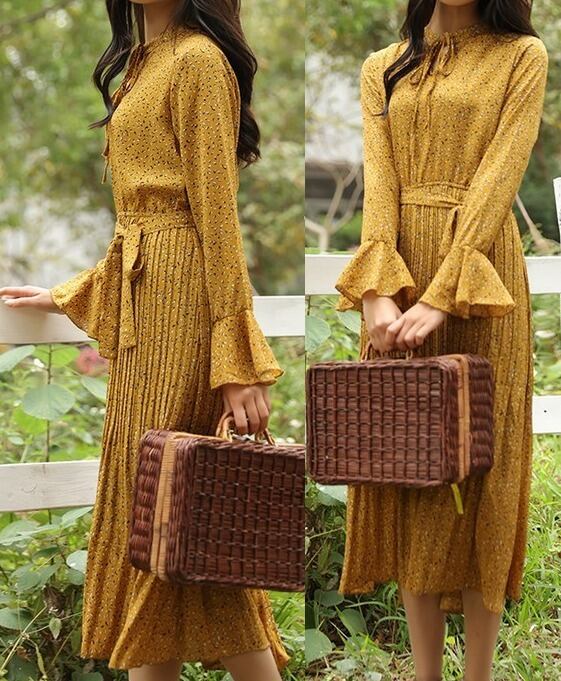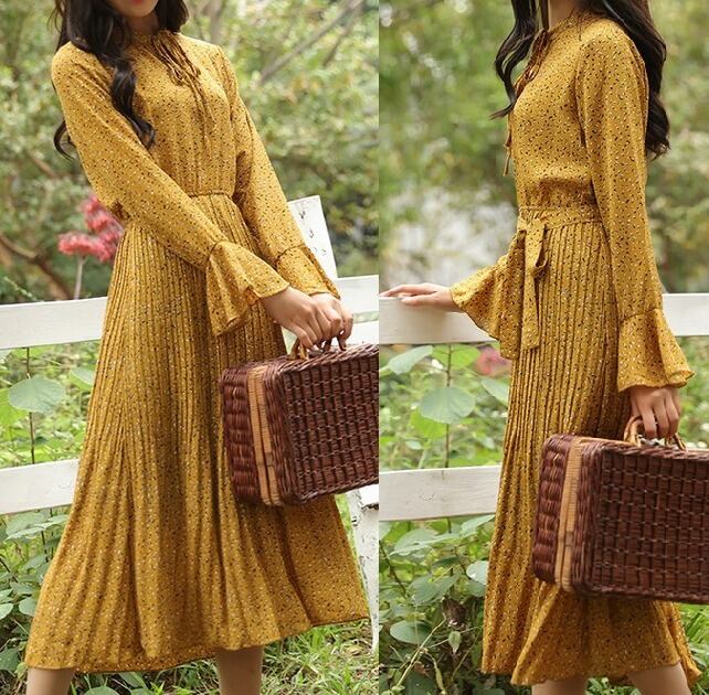 結びリボン★プリーツスカート★長袖★袖先フレア★ワンピース♪