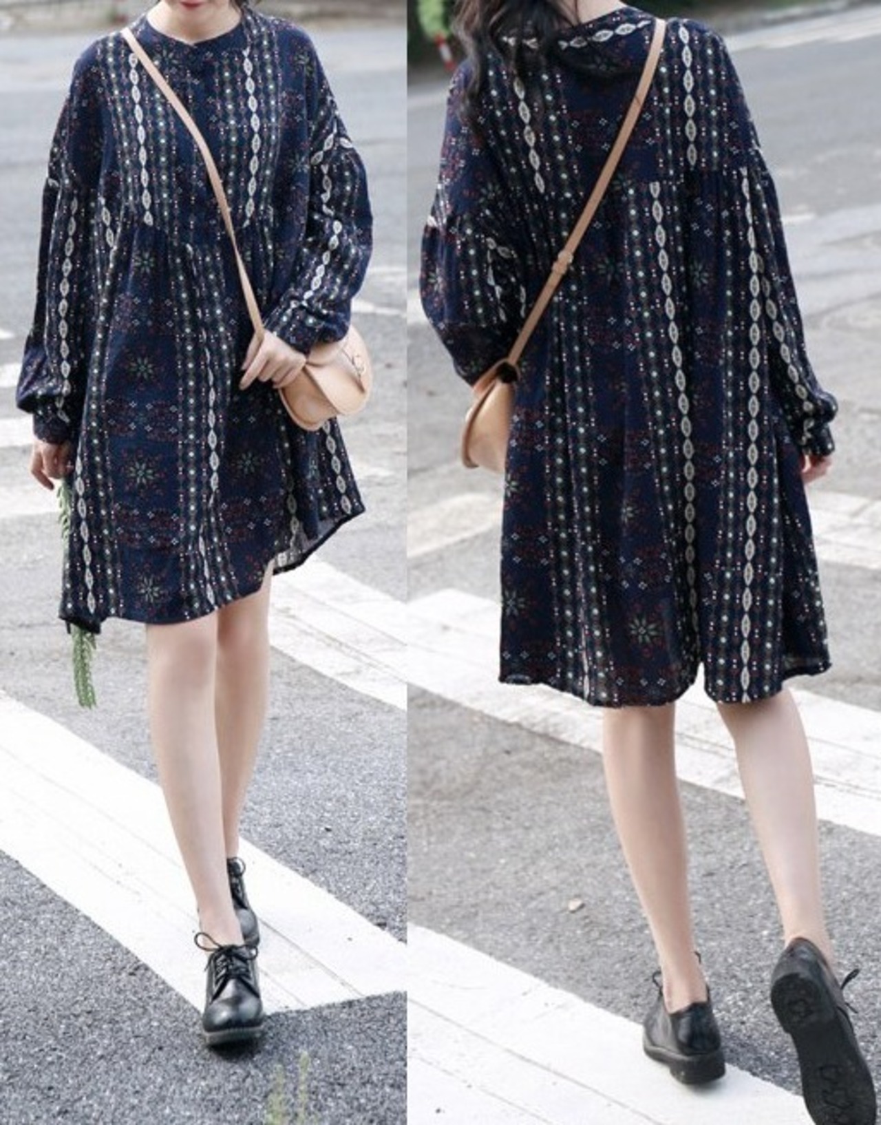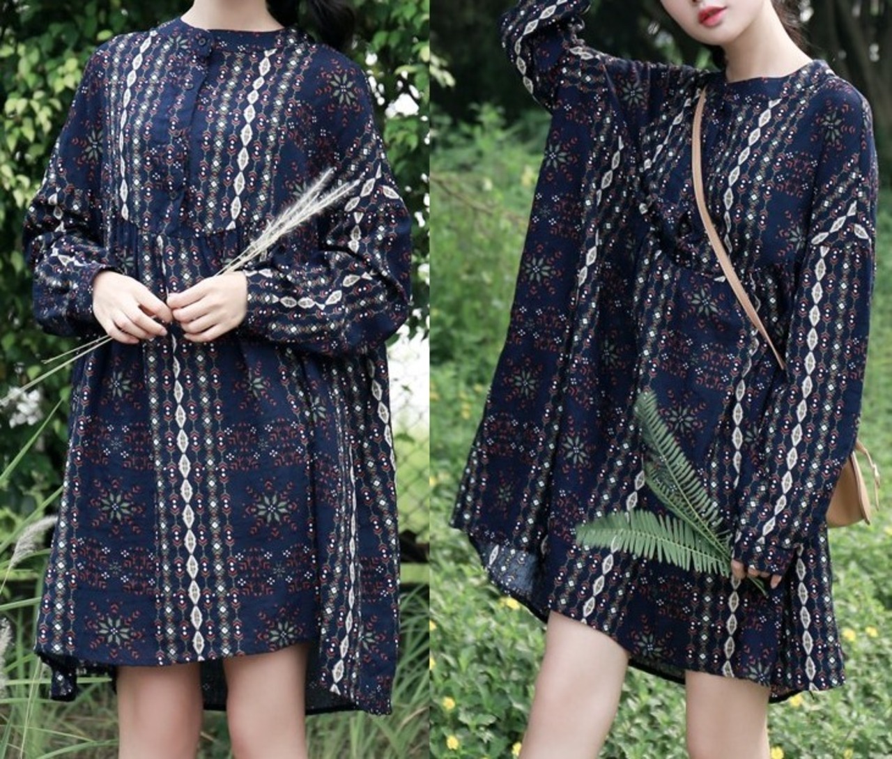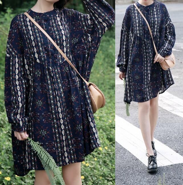 デザイン柄★胸元ボタン★ハイウエスト切替★ミニ・ワンピース♪