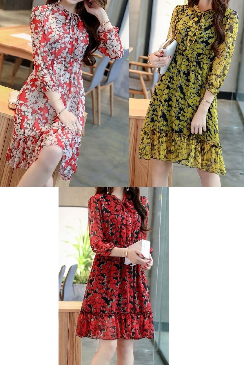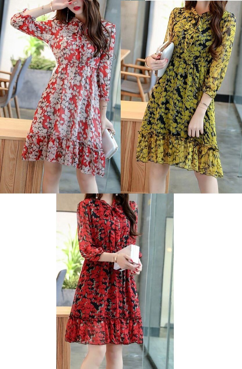 花柄★胸元結びリボン★七分袖★裾先フリル★ミニ・ワンピース♪