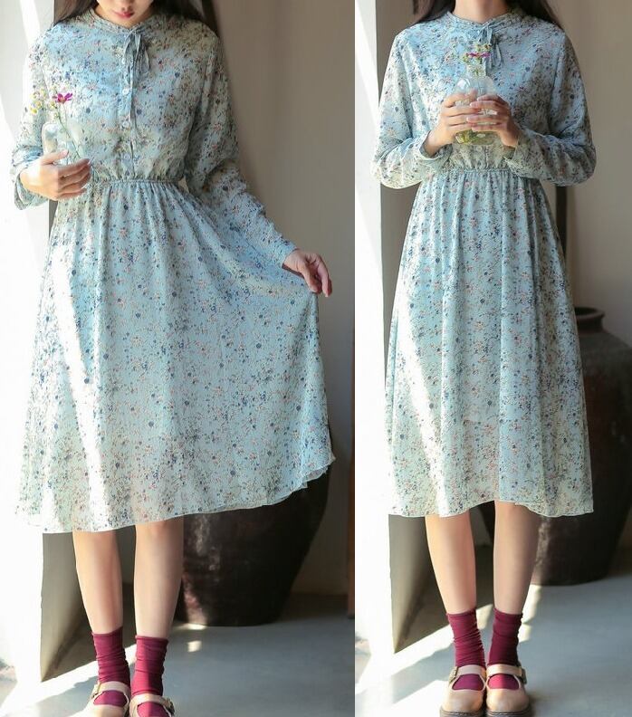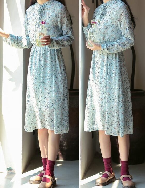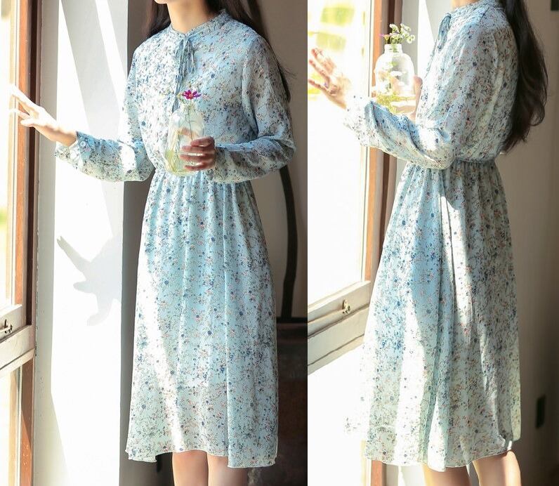 小花柄★結びリボン★フロントボタン★長袖★フレアワンピース♪