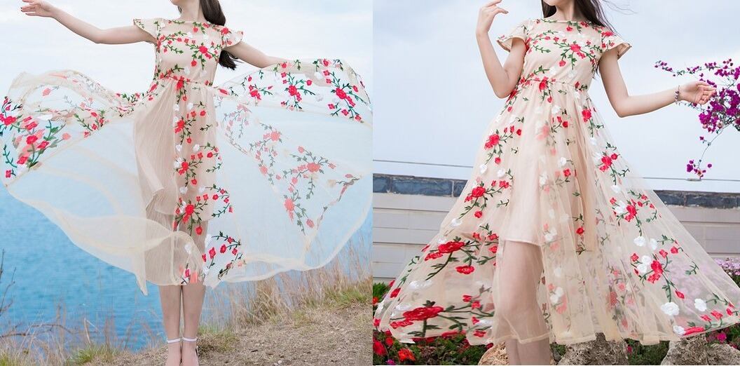 花柄刺繍★シースルー★ラウンドネック★半袖★ワンピース♪