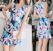 花柄★Vネック★ノースリーブ★裾先フリル★ミニ・ワンピース♪