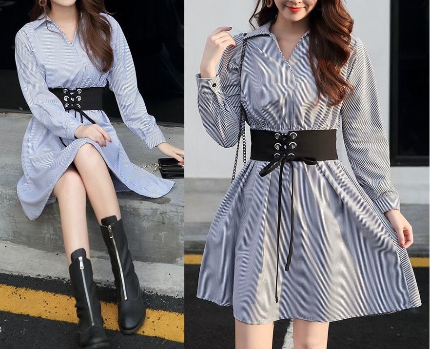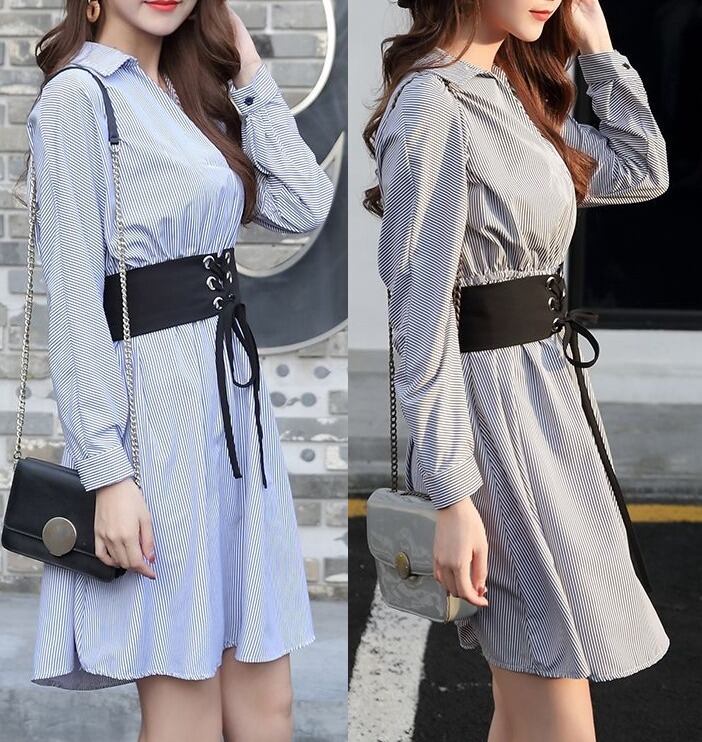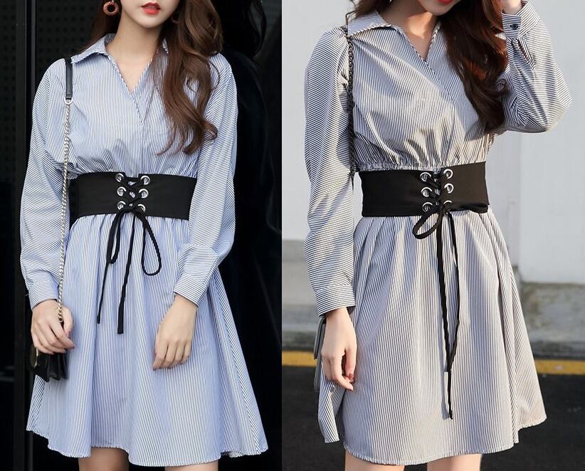 レースアップベルト★ストライプ柄★襟付き★ミニ・ワンピース♪