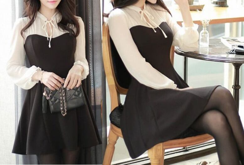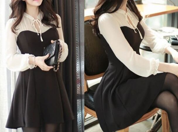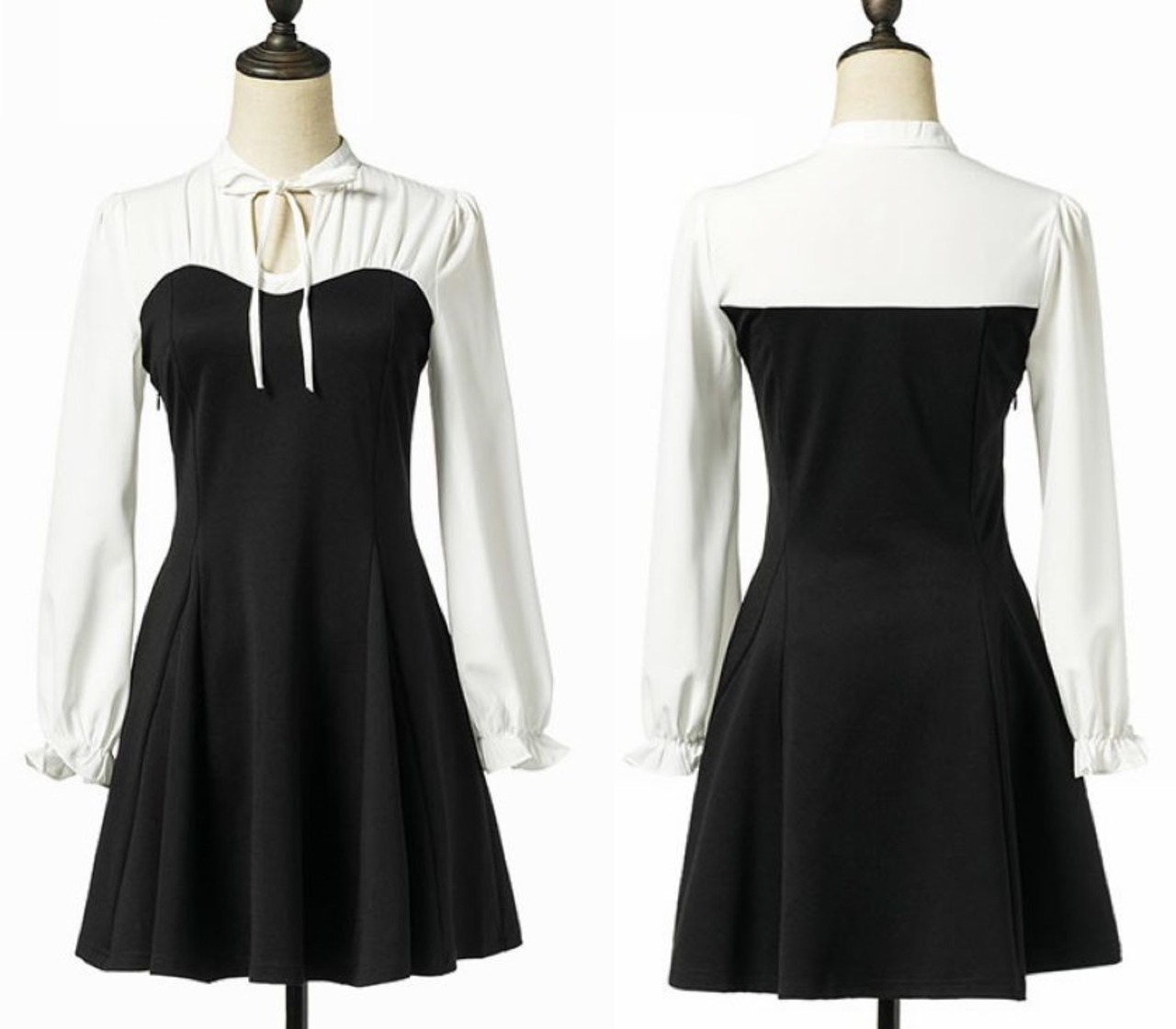 結びリボン★バイカラー切替★長袖★フレア★ミニ・ワンピース♪