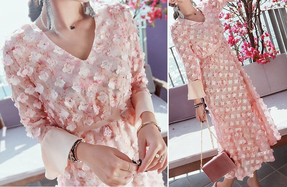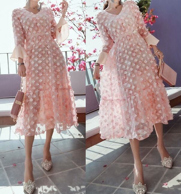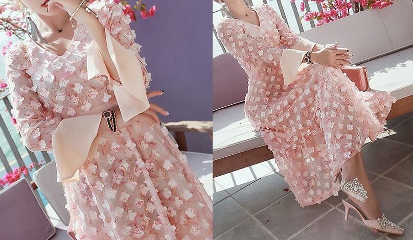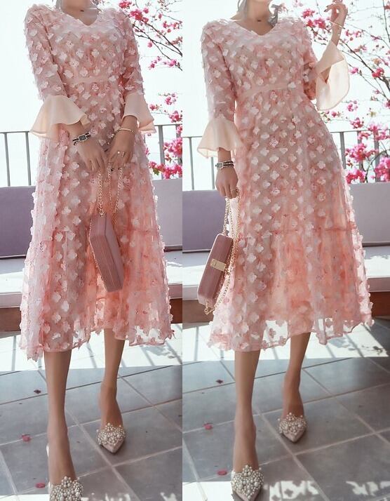 花びらデコ★花柄★Vネック★袖先切替フレア★ワンピース♪