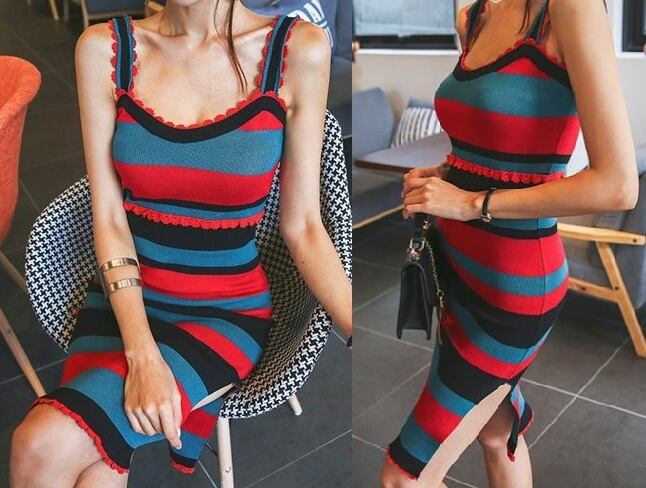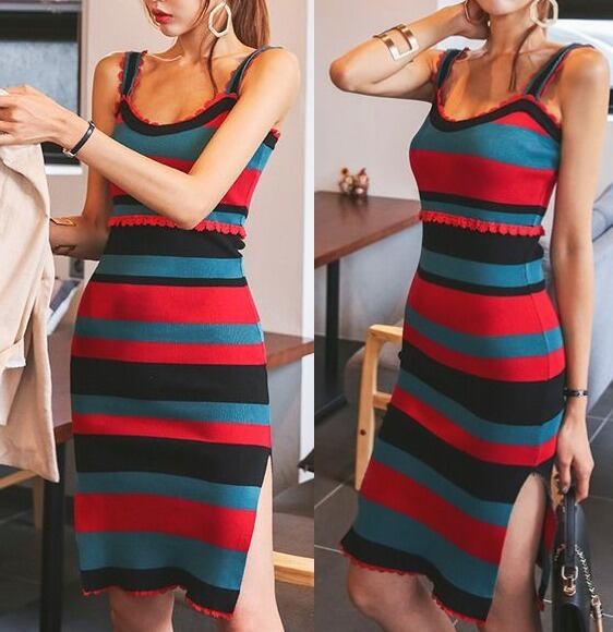 ボーダー★フリル風縁取り★サイドスリット★タイトワンピース♪