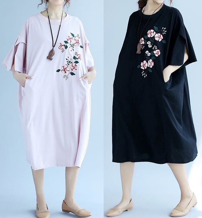 花柄刺繍★デザイン袖★七分袖★ラウンドネック★ワンピース♪