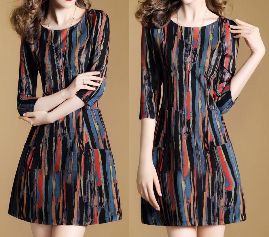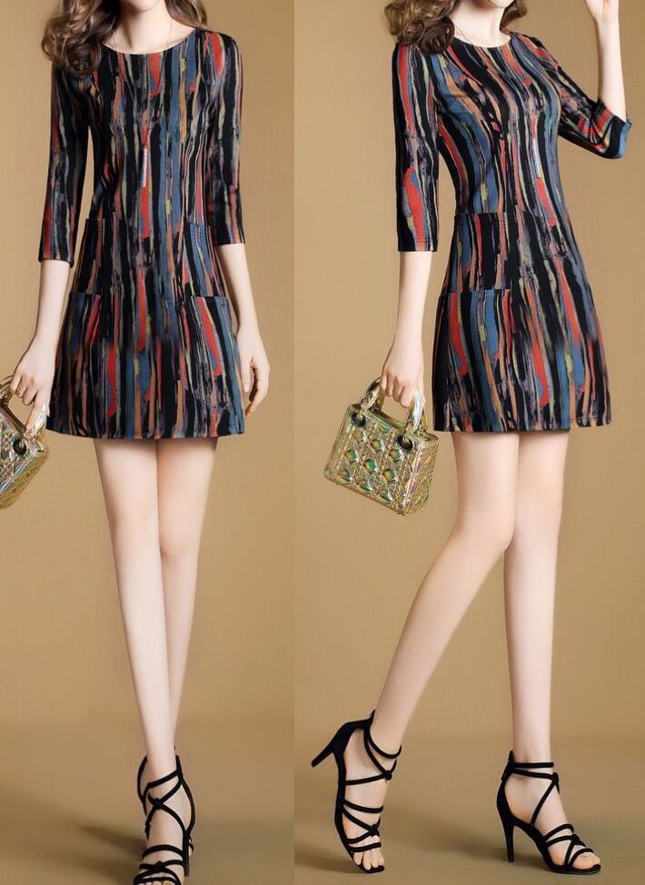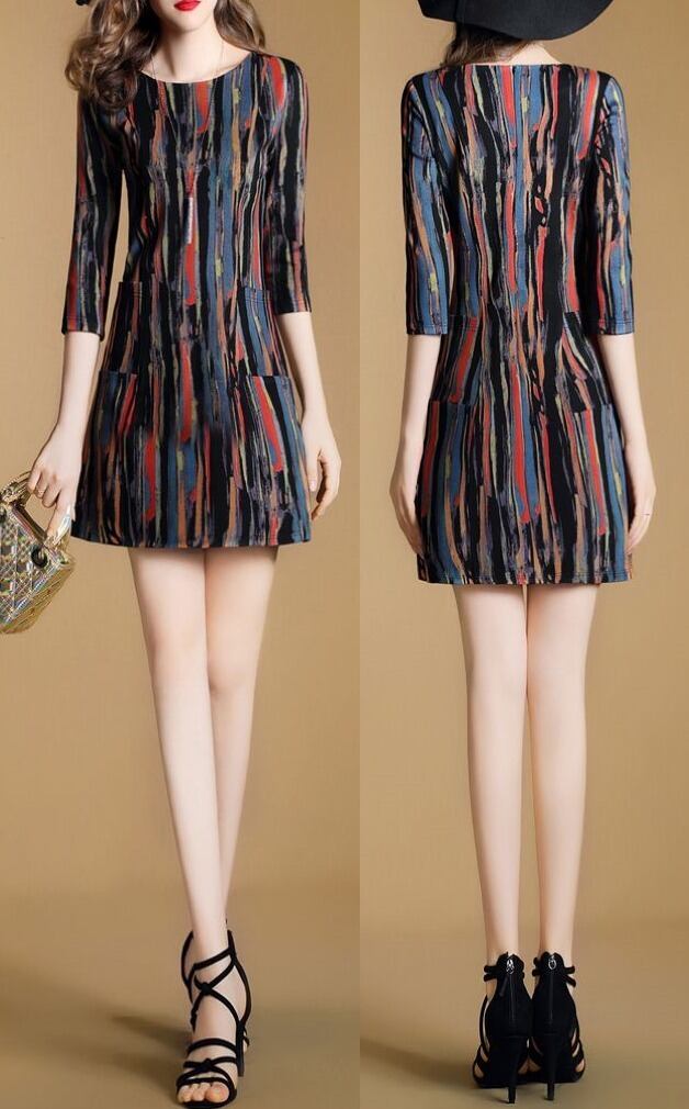 縦ライン・デザイン柄★ラウンドネック★七分袖★ワンピース♪