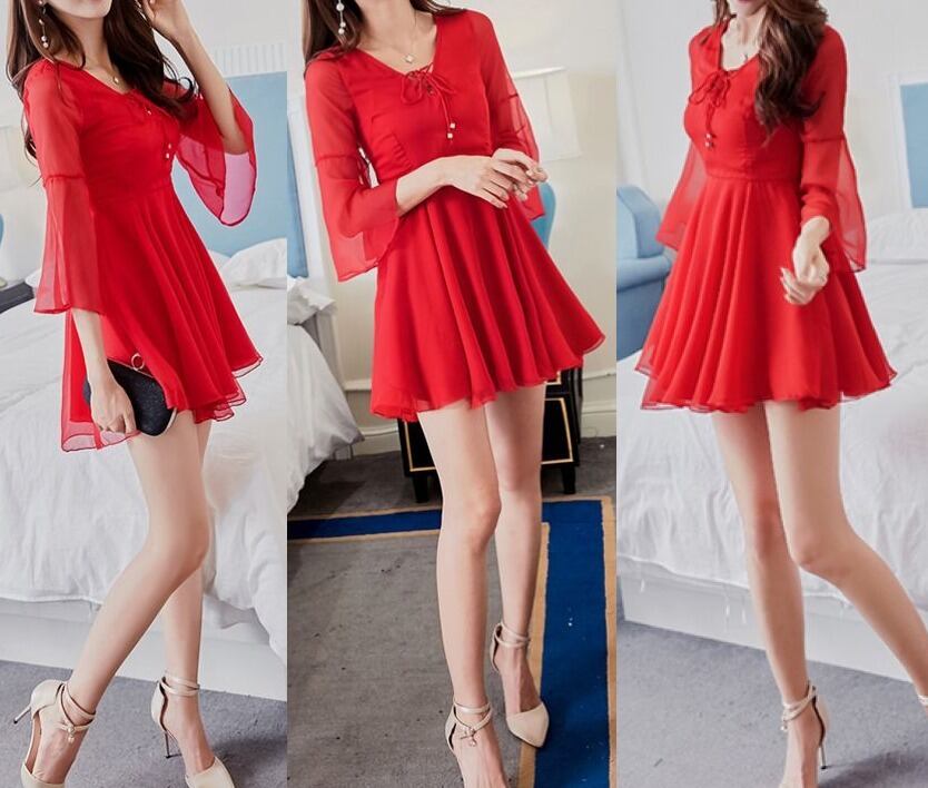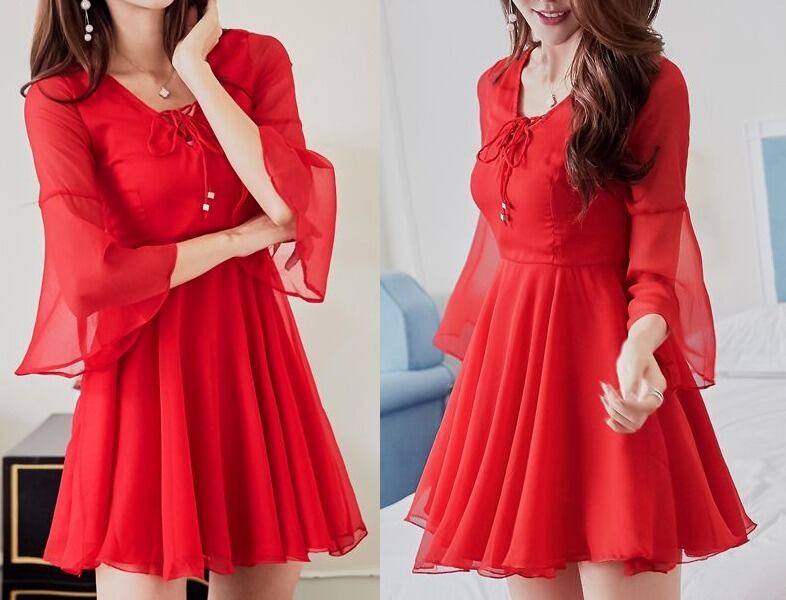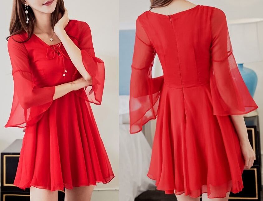 結びリボン★シースルー★フレア・七分袖★ミニ・ワンピース♪