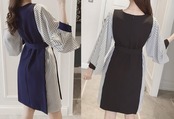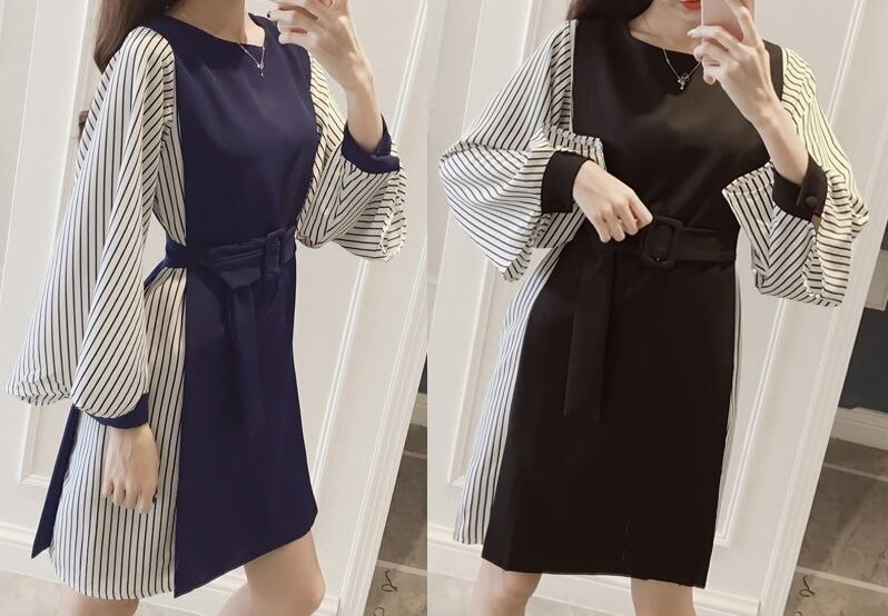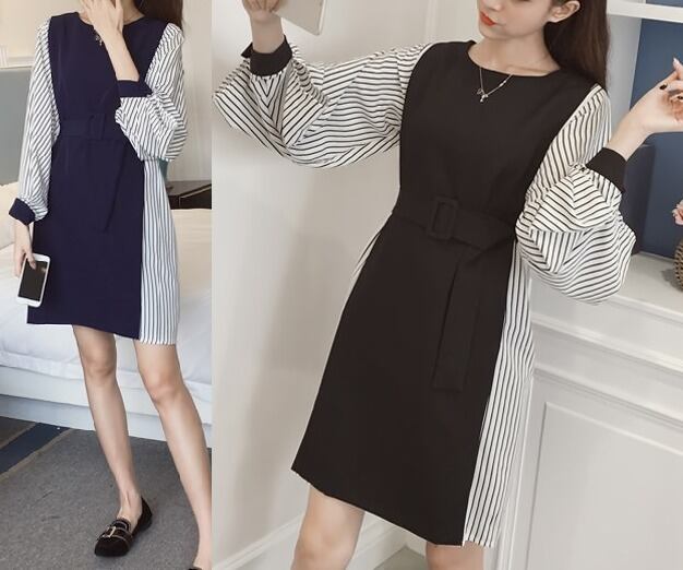 ストライプ柄★ウエストベルト★長袖★切替★ワンピース♪