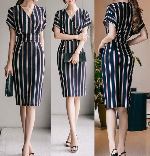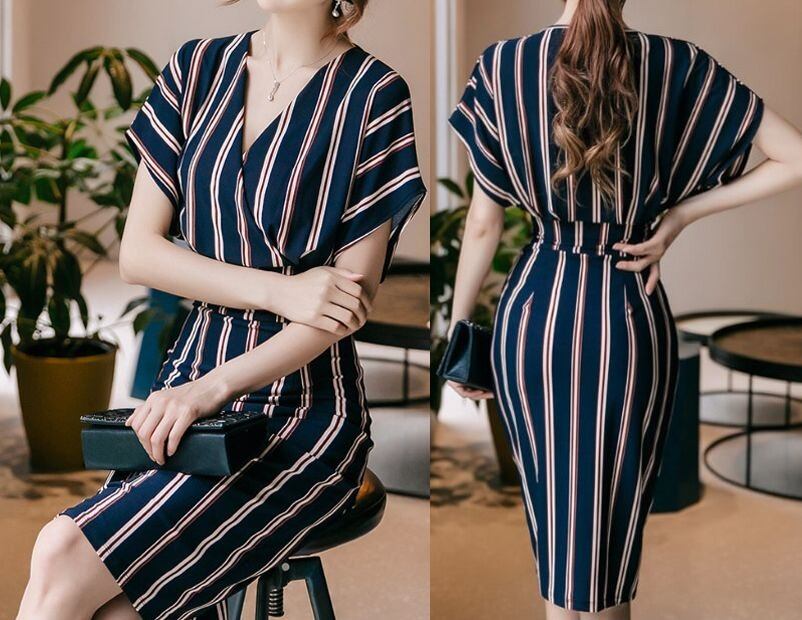 ストライプ★カシュクール風★Vネック★タイト・ワンピース♪