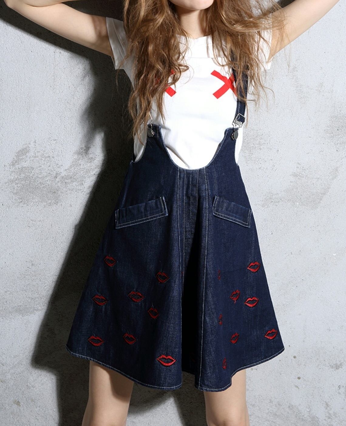 新作 オシャレ♪リッププリントデニムジャンパスカート