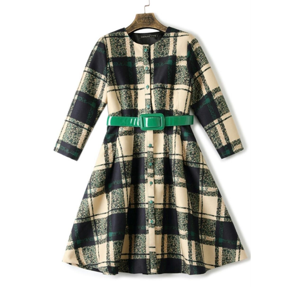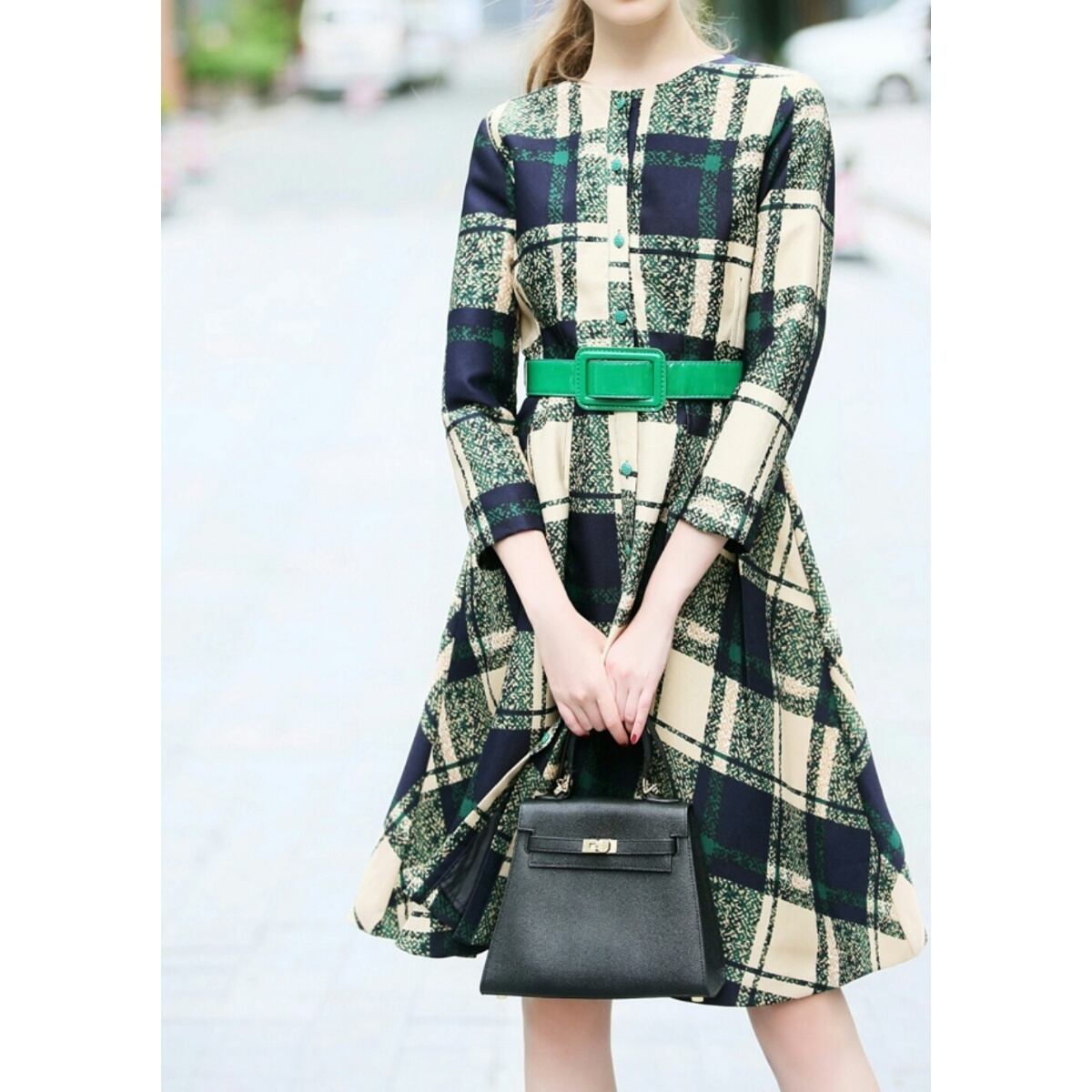 新作 オシャレ♪2色/ノーカラーチェックフレアワンピース