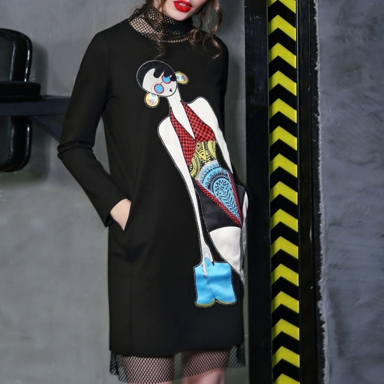 人目を引くオフコーデにビックガール模様/黒ワンピース