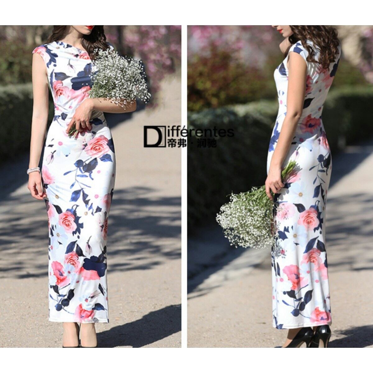 カラーが綺麗フェミニンな大きい花柄ノースリーブロングドレス