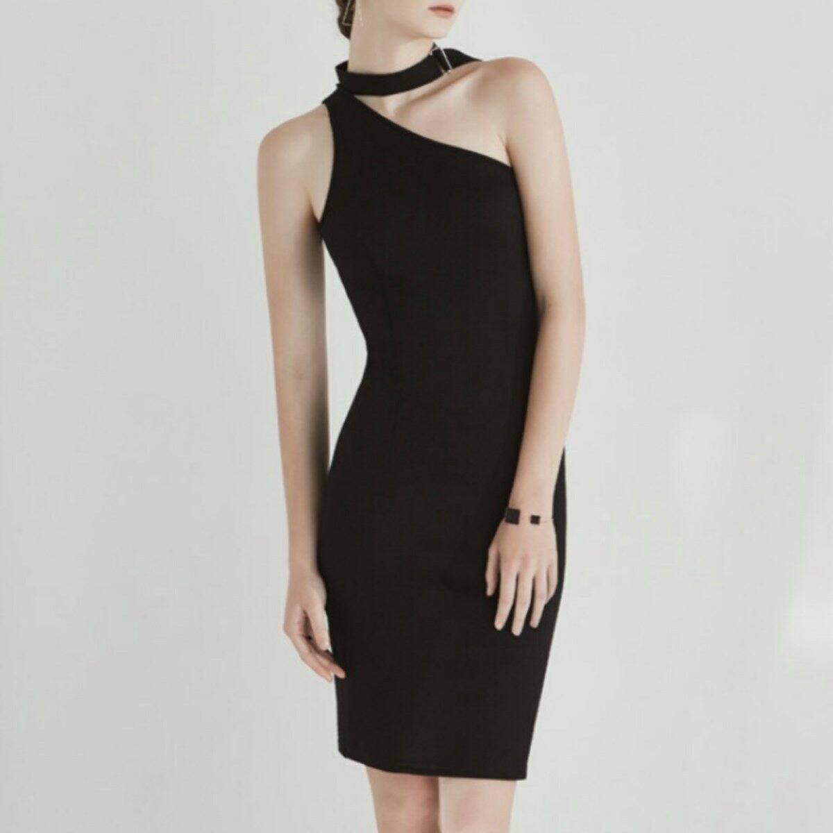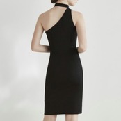 大人かっこいいパーティーコーデ首ベルトアシンメトリー黒ドレス