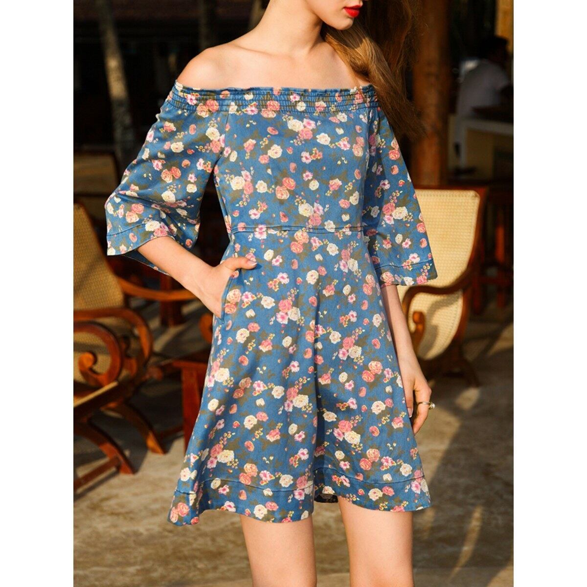ガーリーな花柄&オフショルダーデニムフレアワンピース