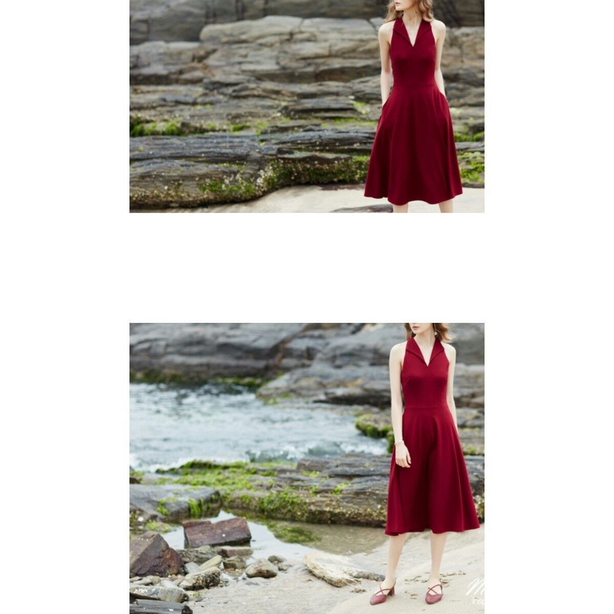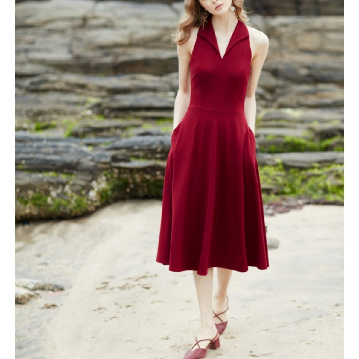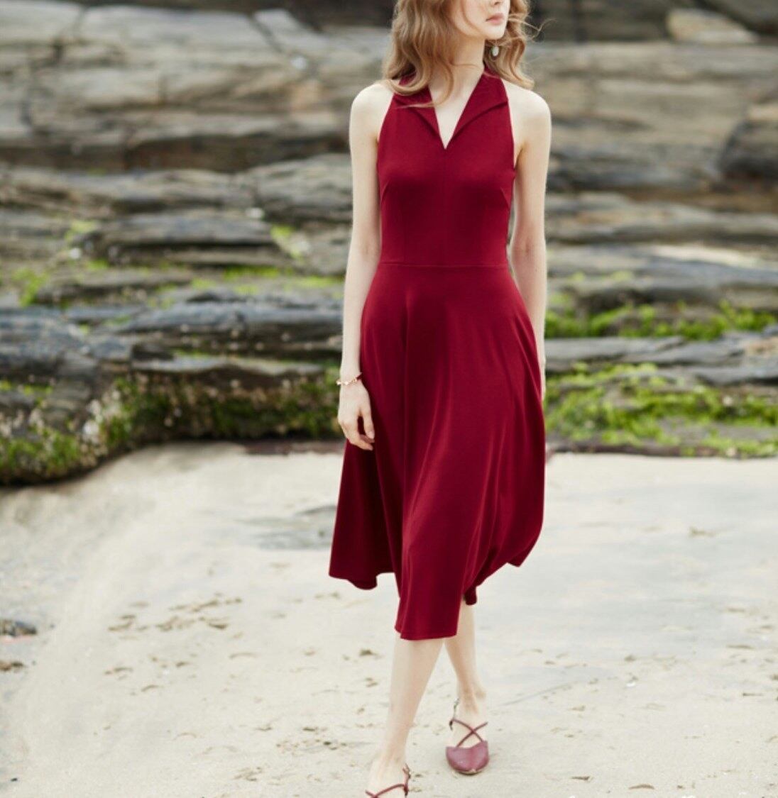 首元綺麗なVネックノースリーブフレアワインレッドワンピース