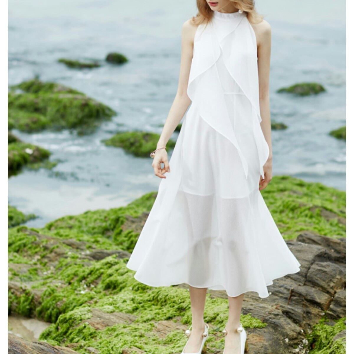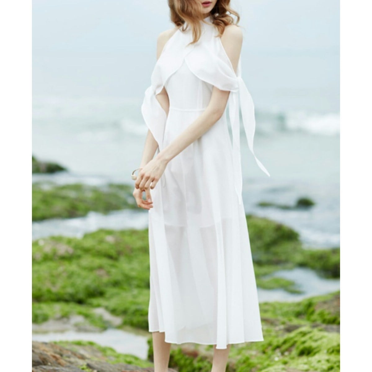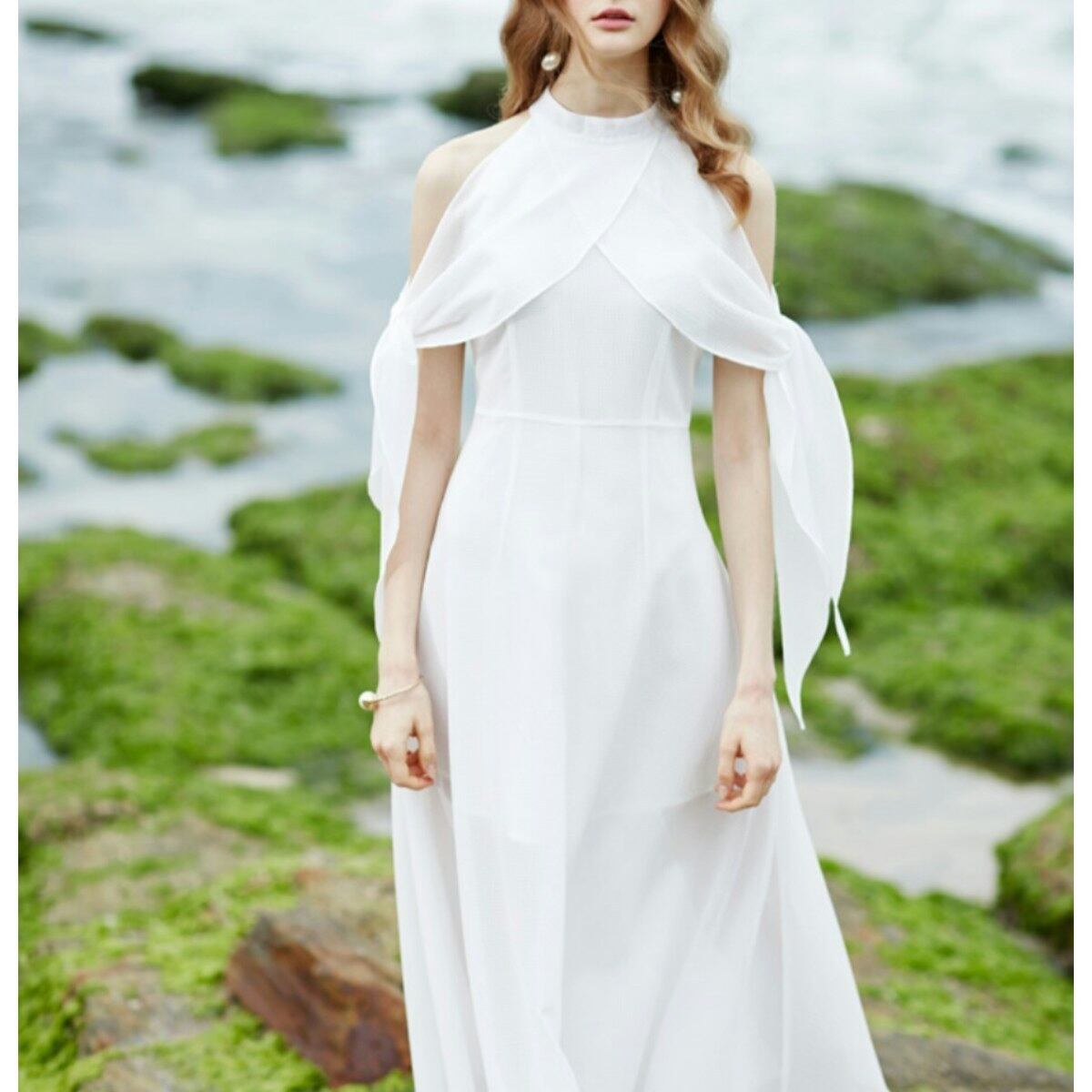 バストラインのドレープのアレンジが楽しい白のロングドレス