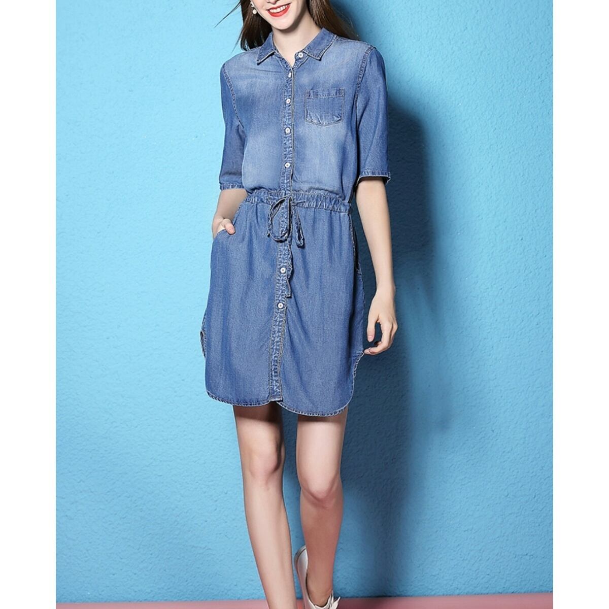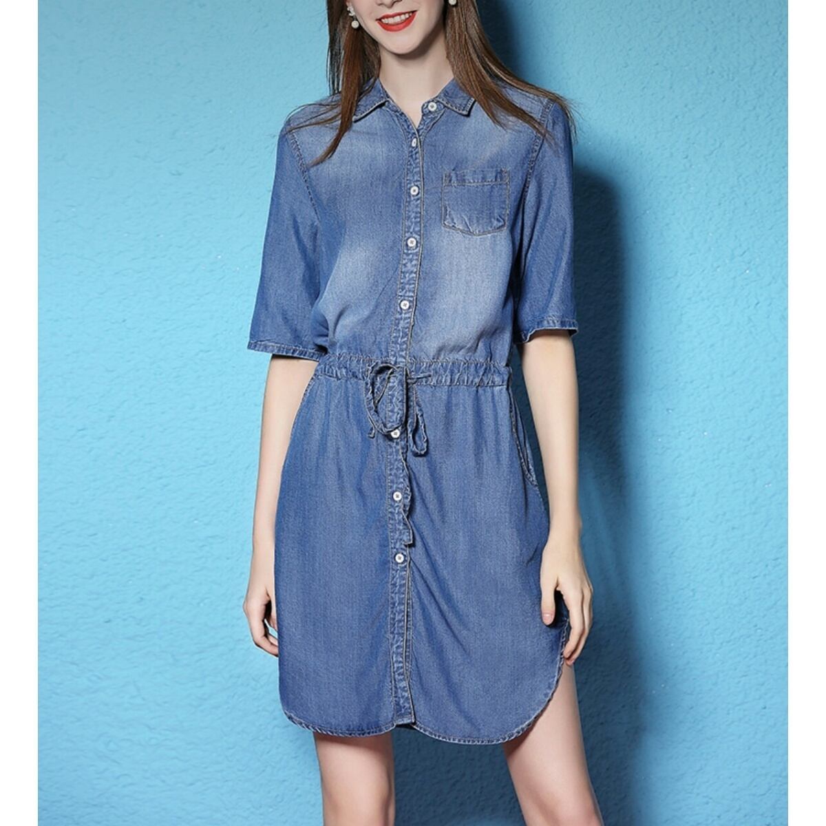 ウエスト調節可能/五分丈袖シンプルなデニムシャツワンピース