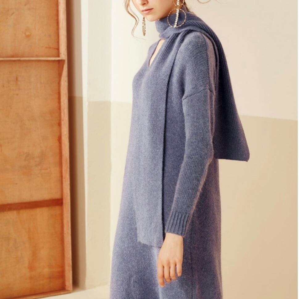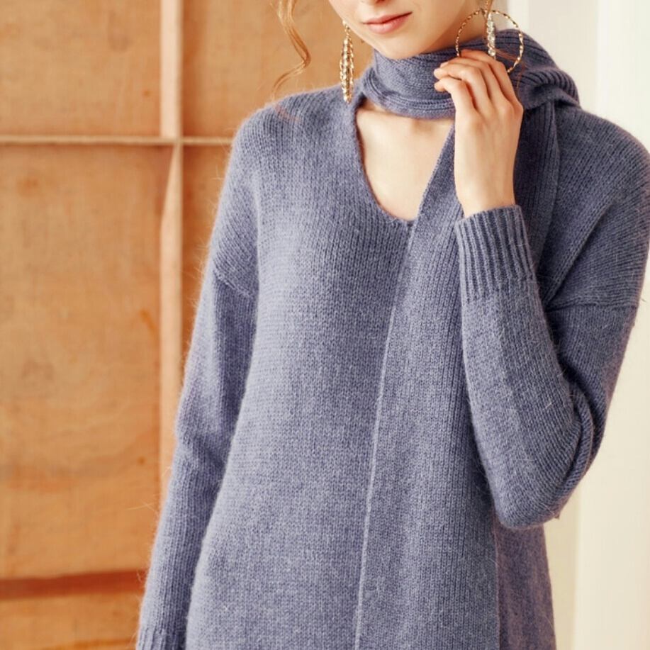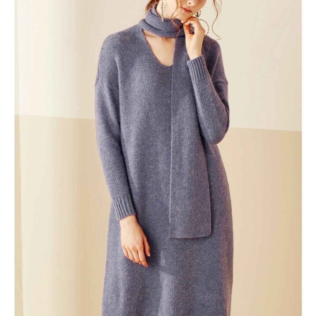 首元マフラー風のラビットファー編込みニットワンピース