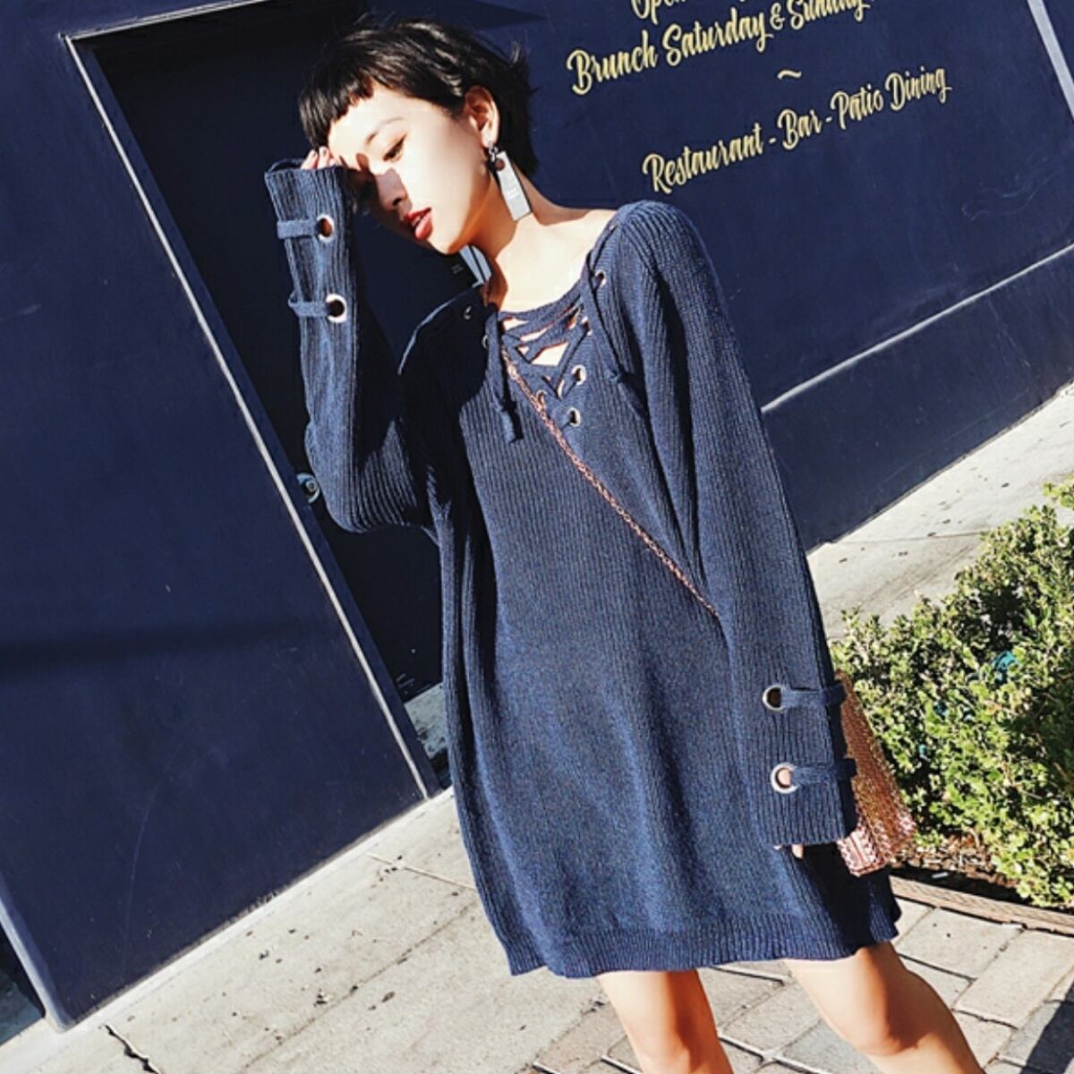 パンツと合わせてお洒落なミニ丈/紐リボンVネックニットワンピ