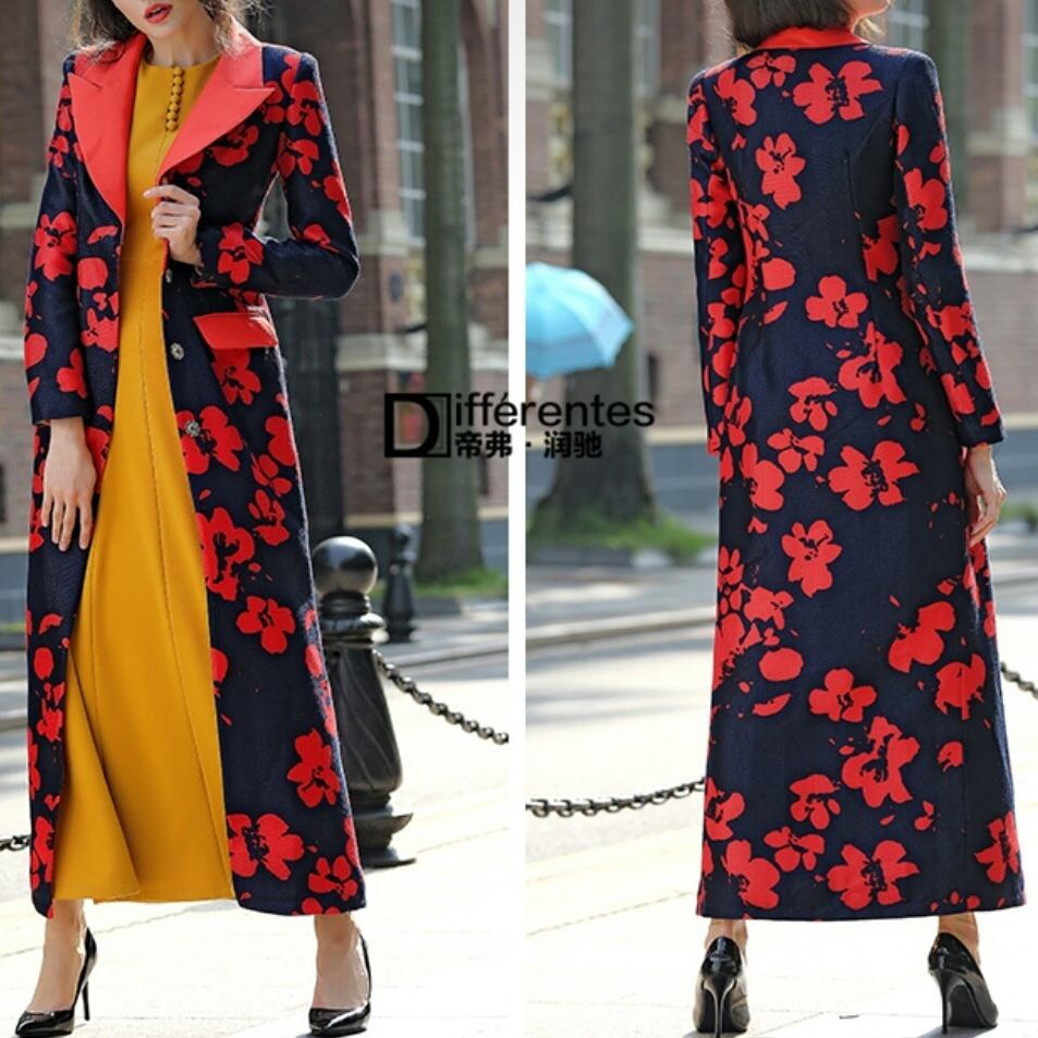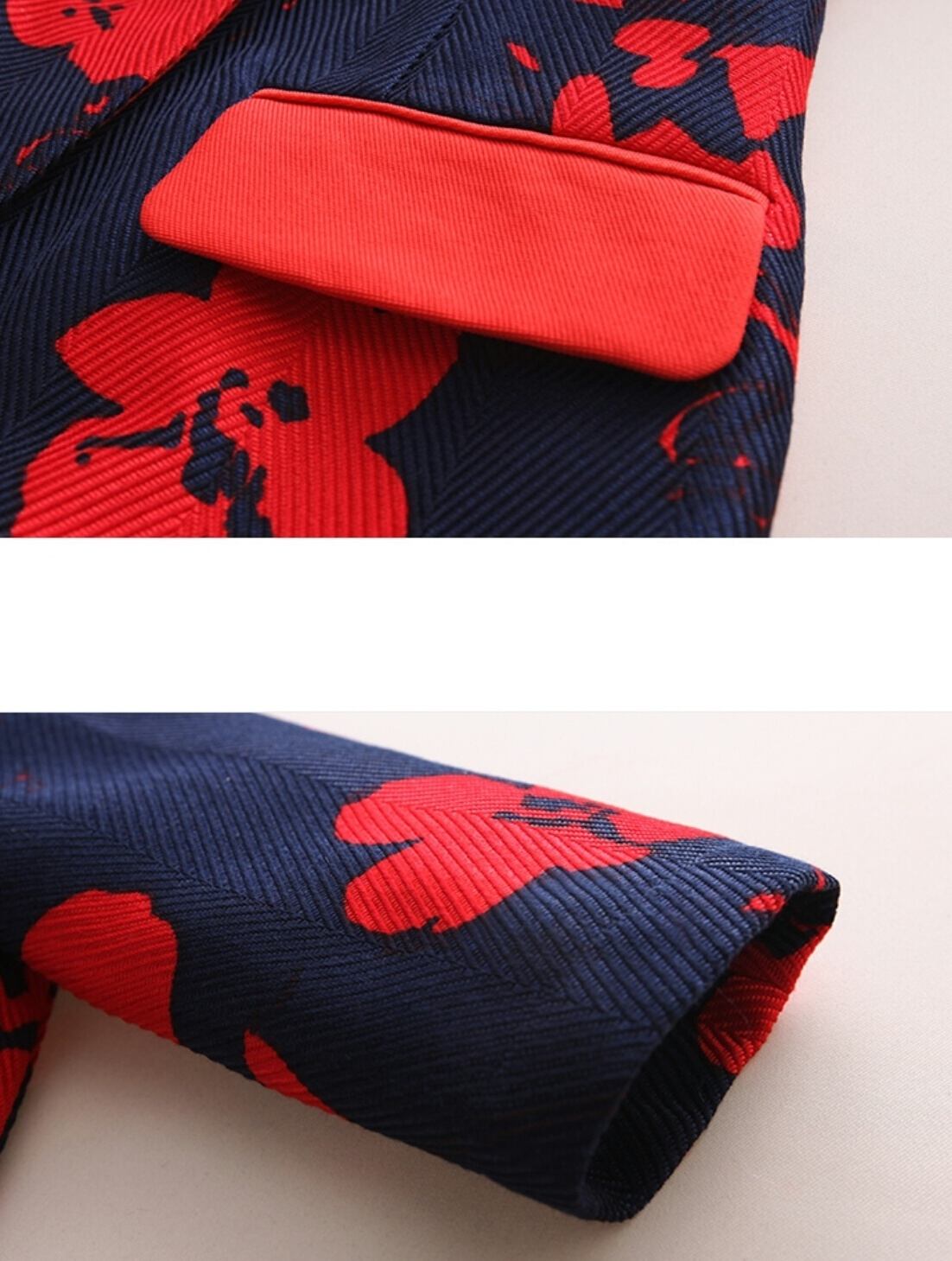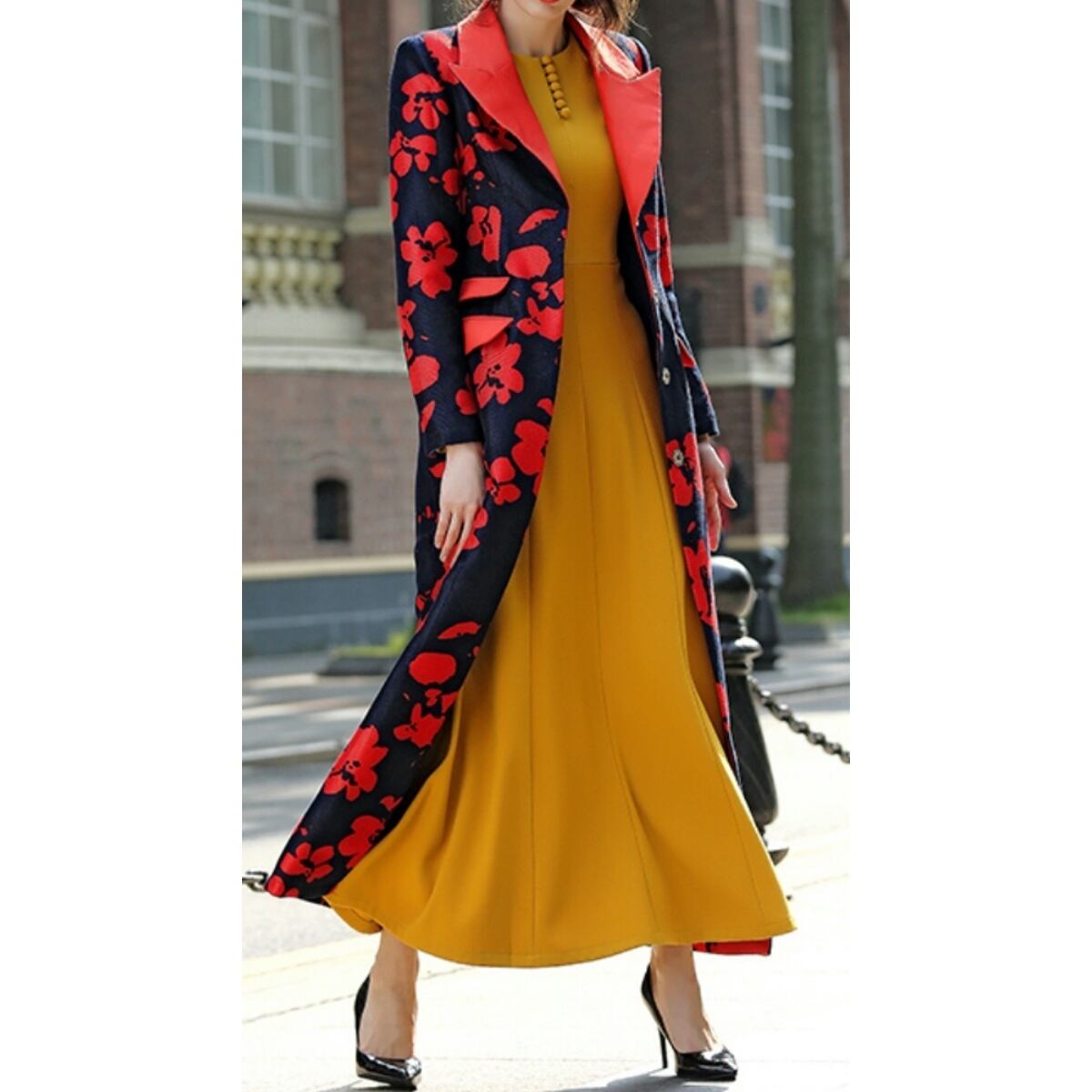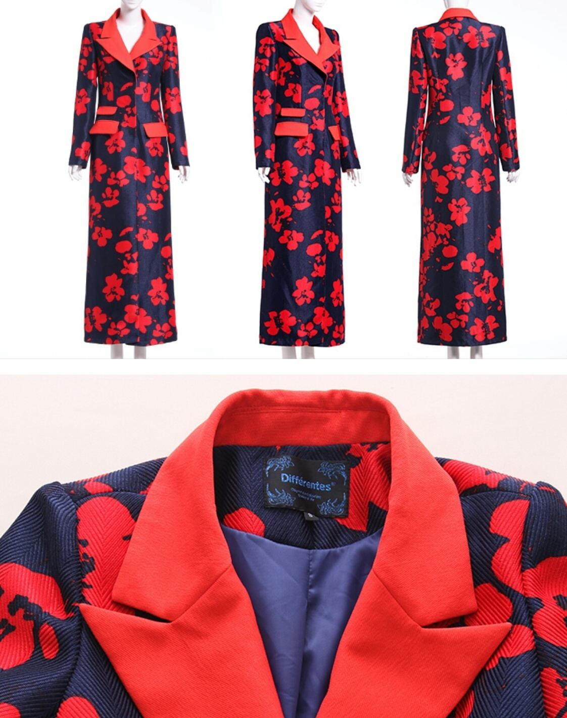 コントラストな赤の花がらが綺麗に描かれたロングコート