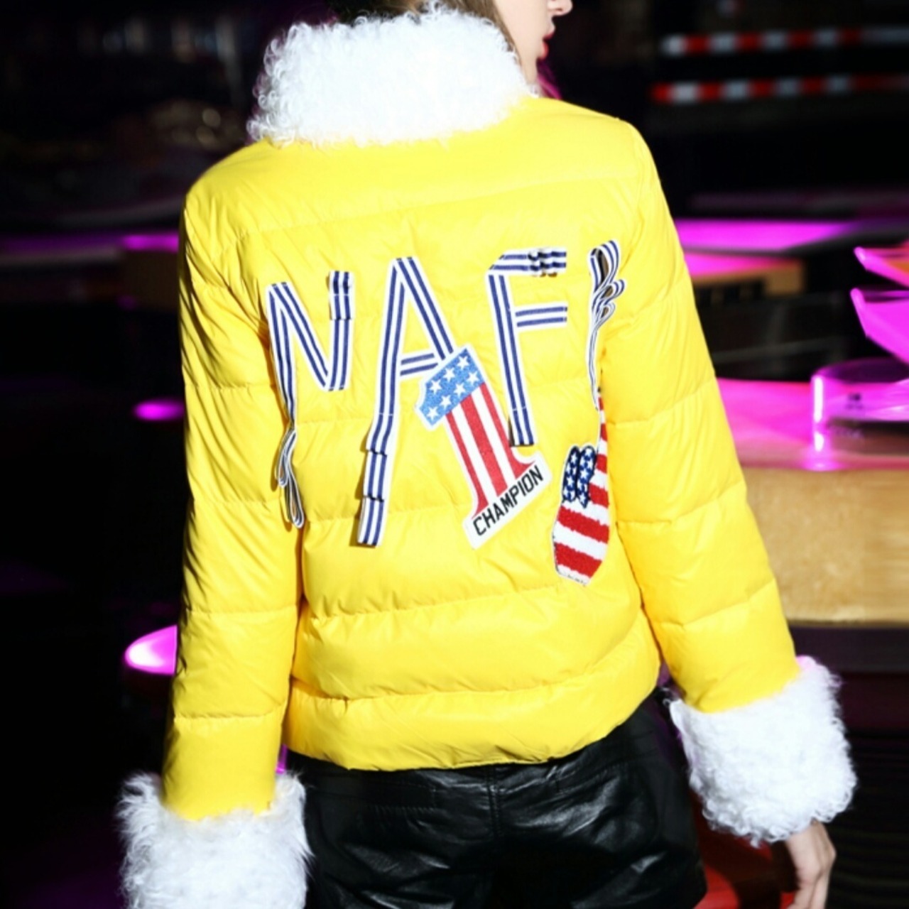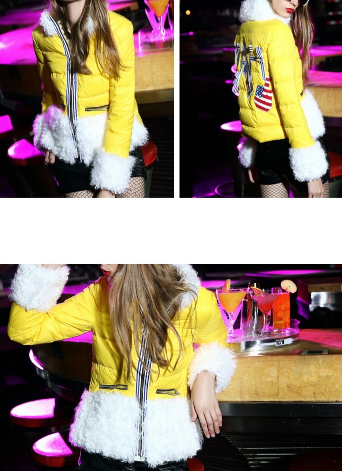 カールファーでカジュアル感を抑えた斬新な黄色ダウンジャケット