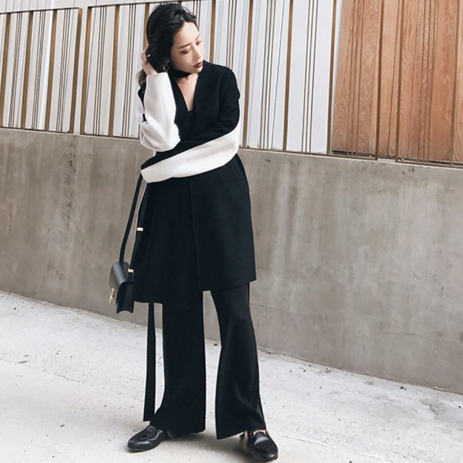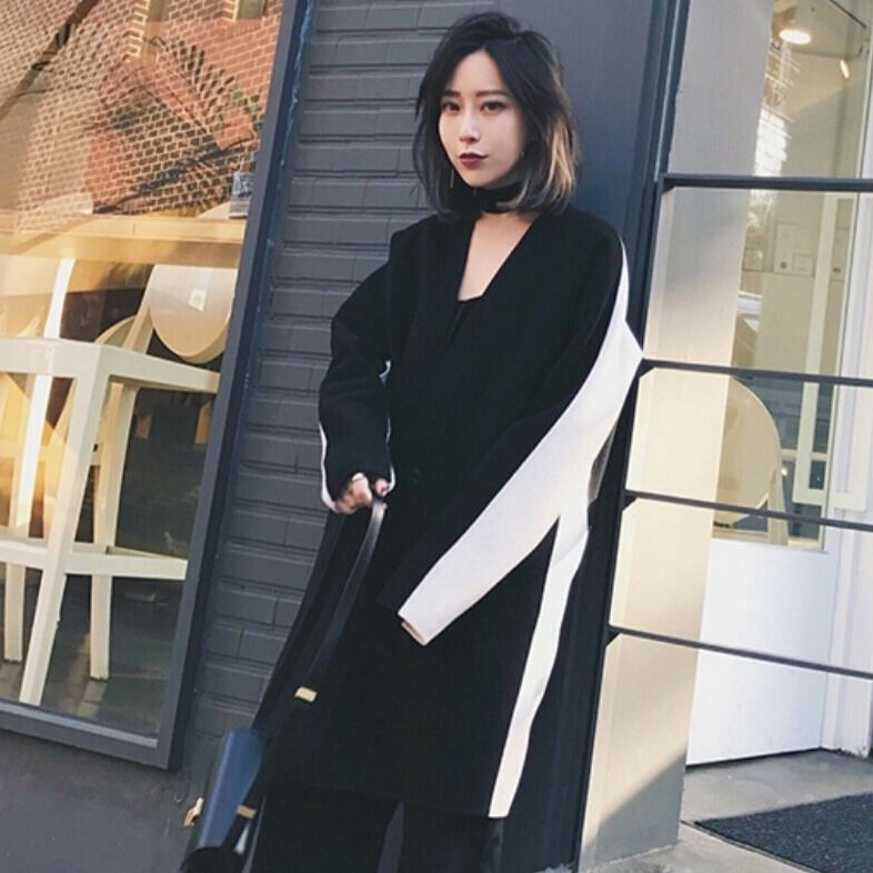 ざっくり着られるノーカラーの大きいサイズの黒白コート