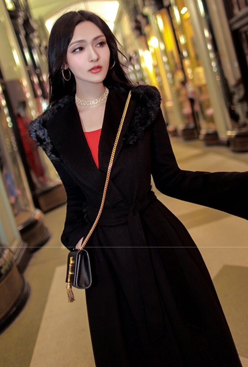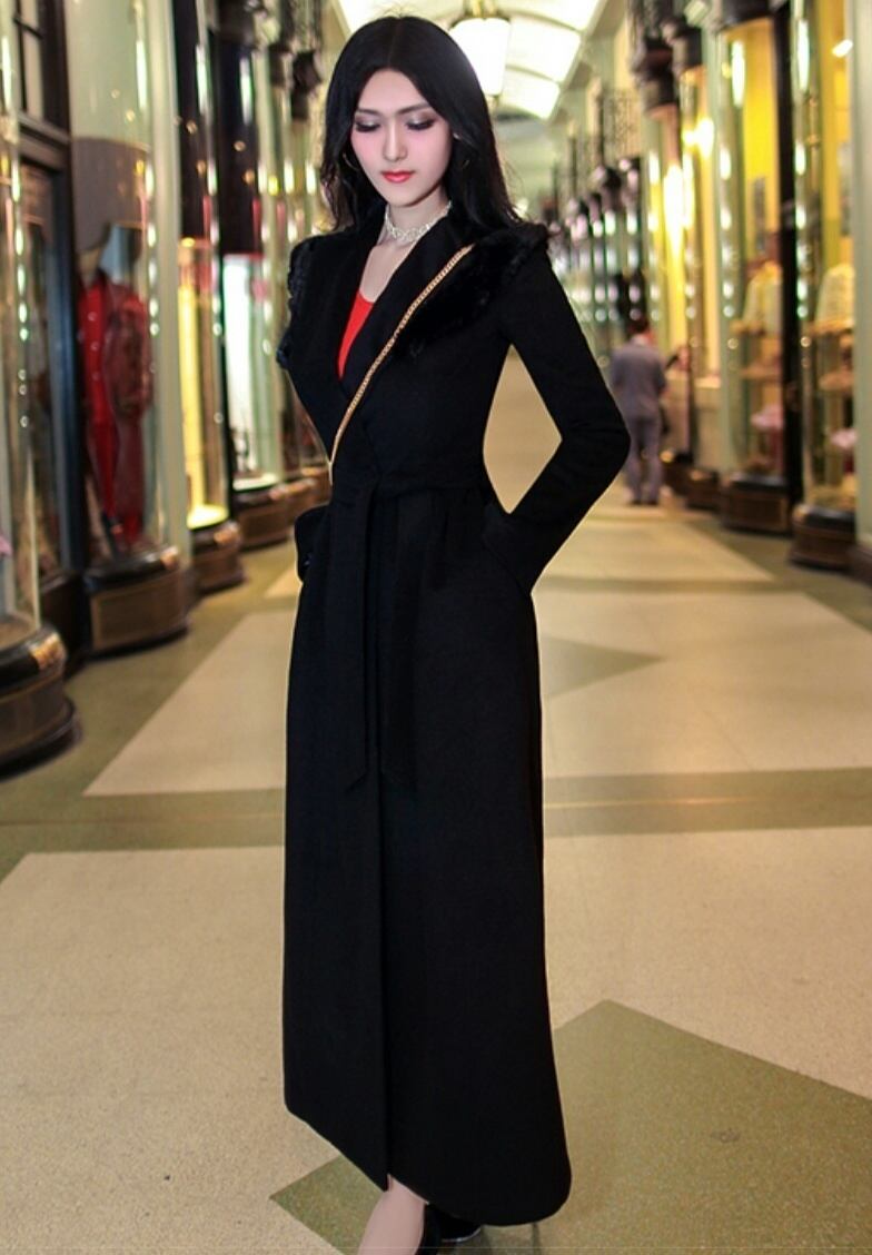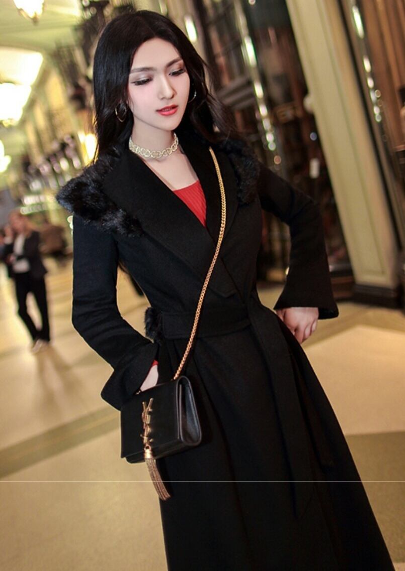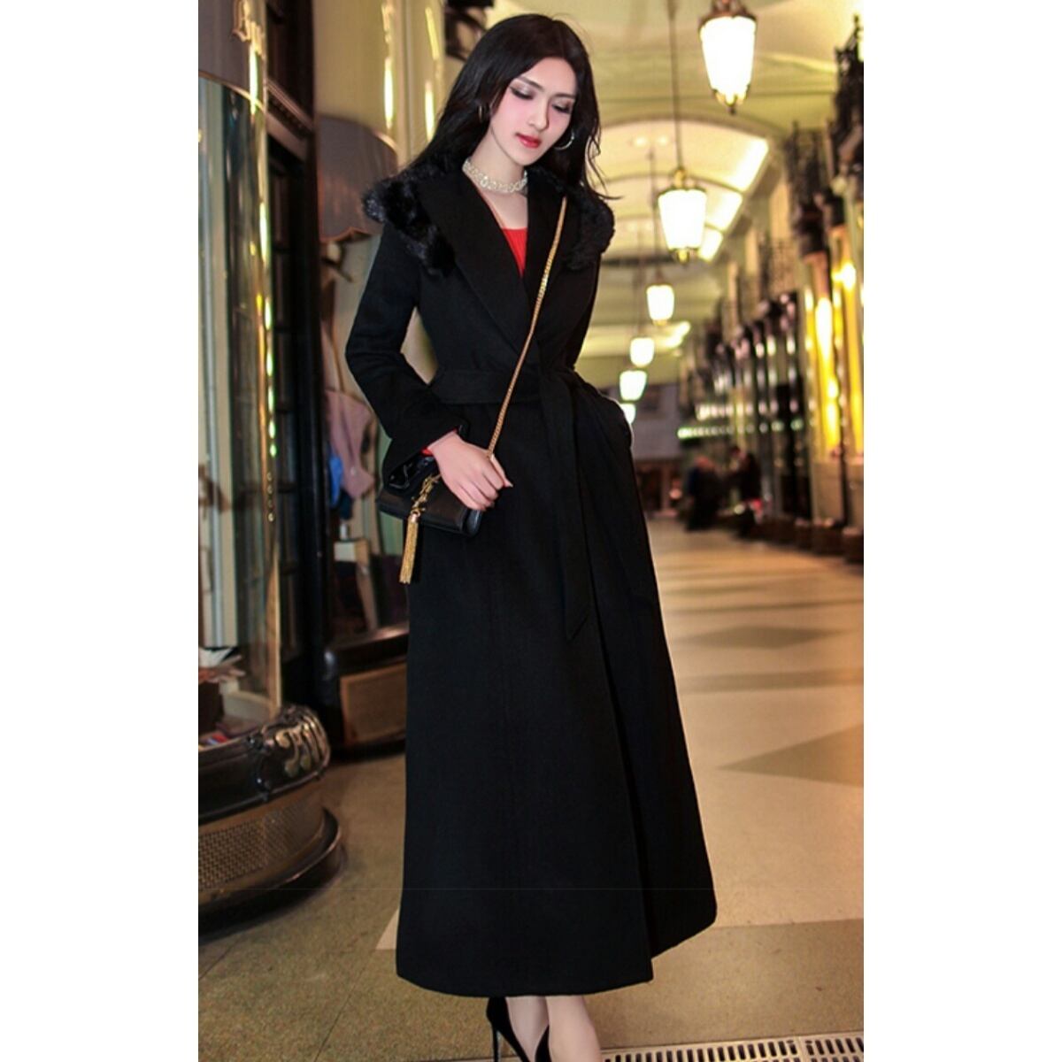 黒ファーがさり気なくコーデにリッチ感を添えたロング丈コート