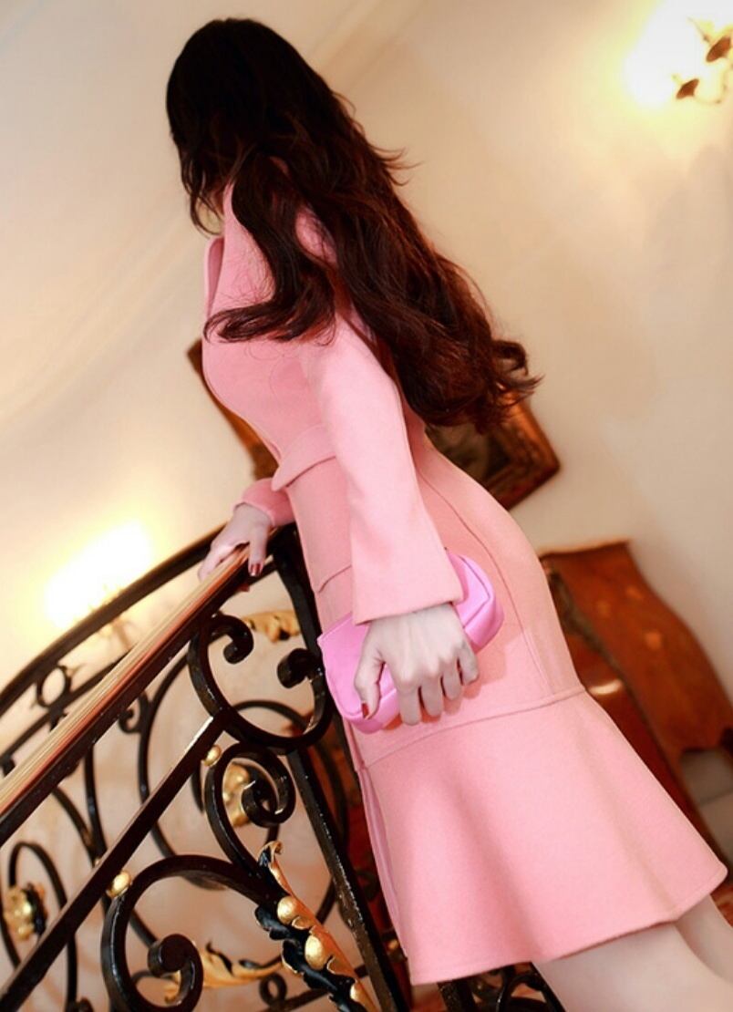 大人かわいいピンク色ヘムラインがポイントワンピース型コート