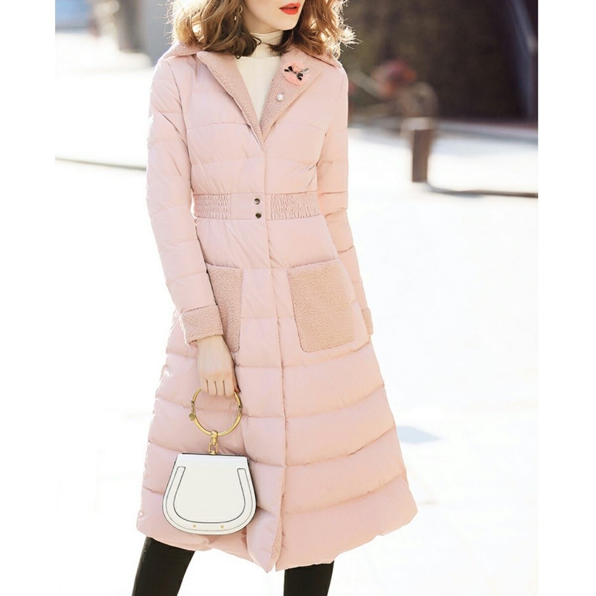 フェミニンな淡いピンク色コンパクトな肩幅ロング丈ダウンコート