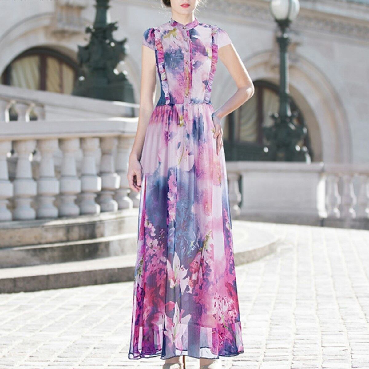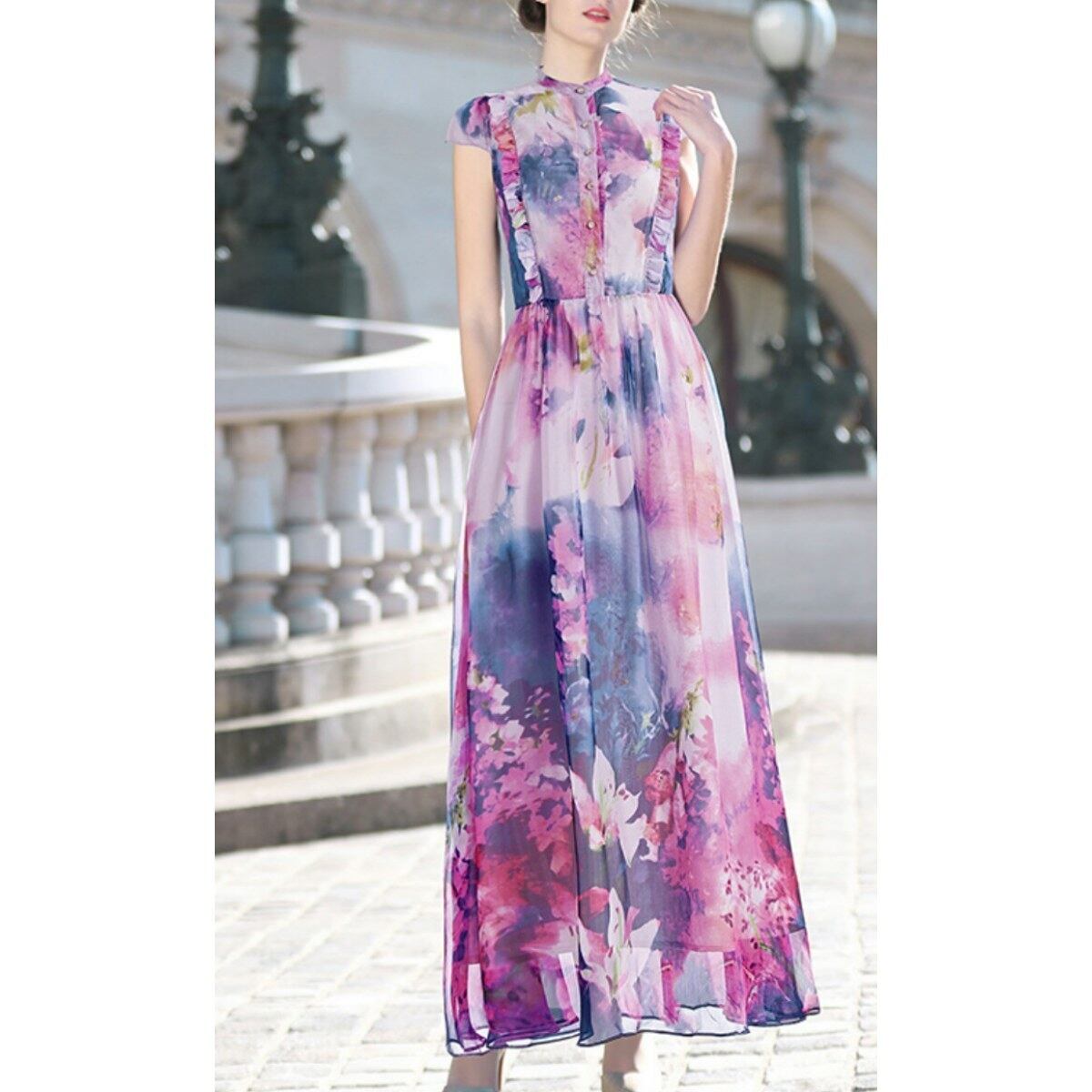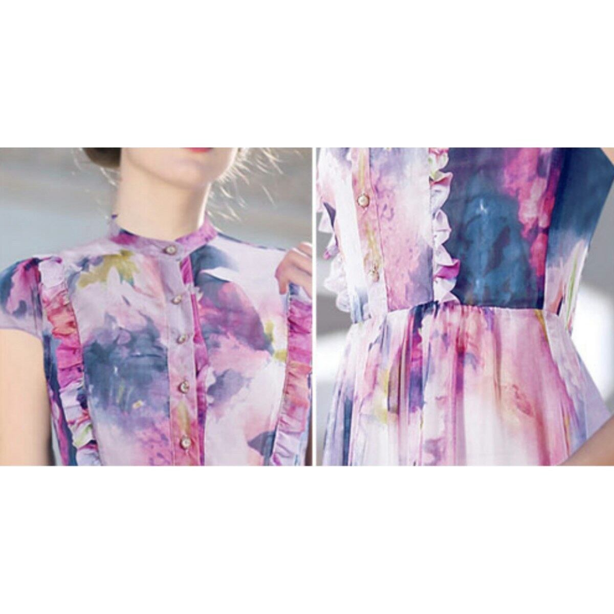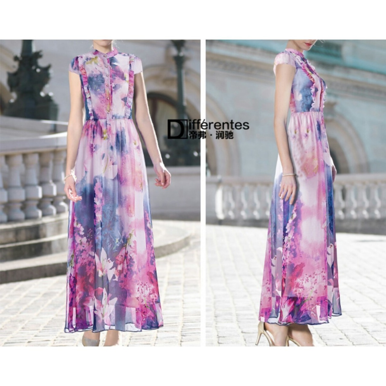 光によって花柄模様のニュアンスが綺麗に映るピンクロングドレス