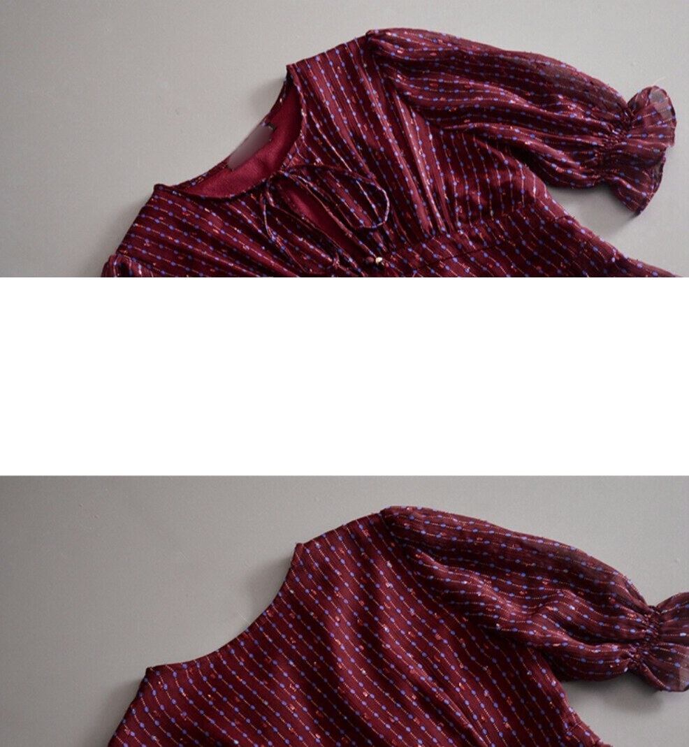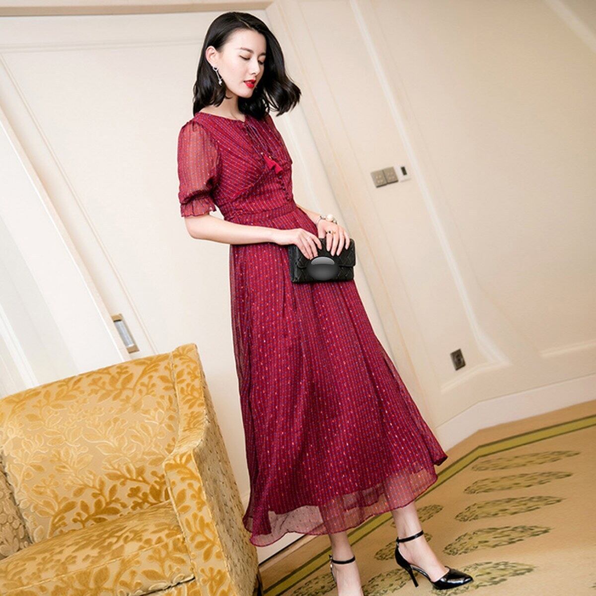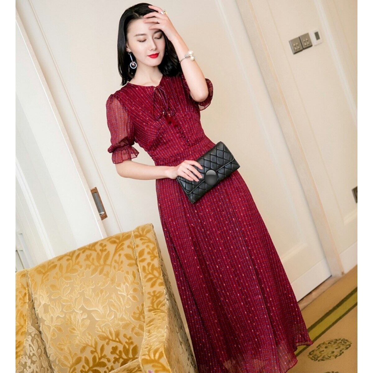 ドット模様で程よく可愛いスパイスロングフレアドレス黄色ワイン