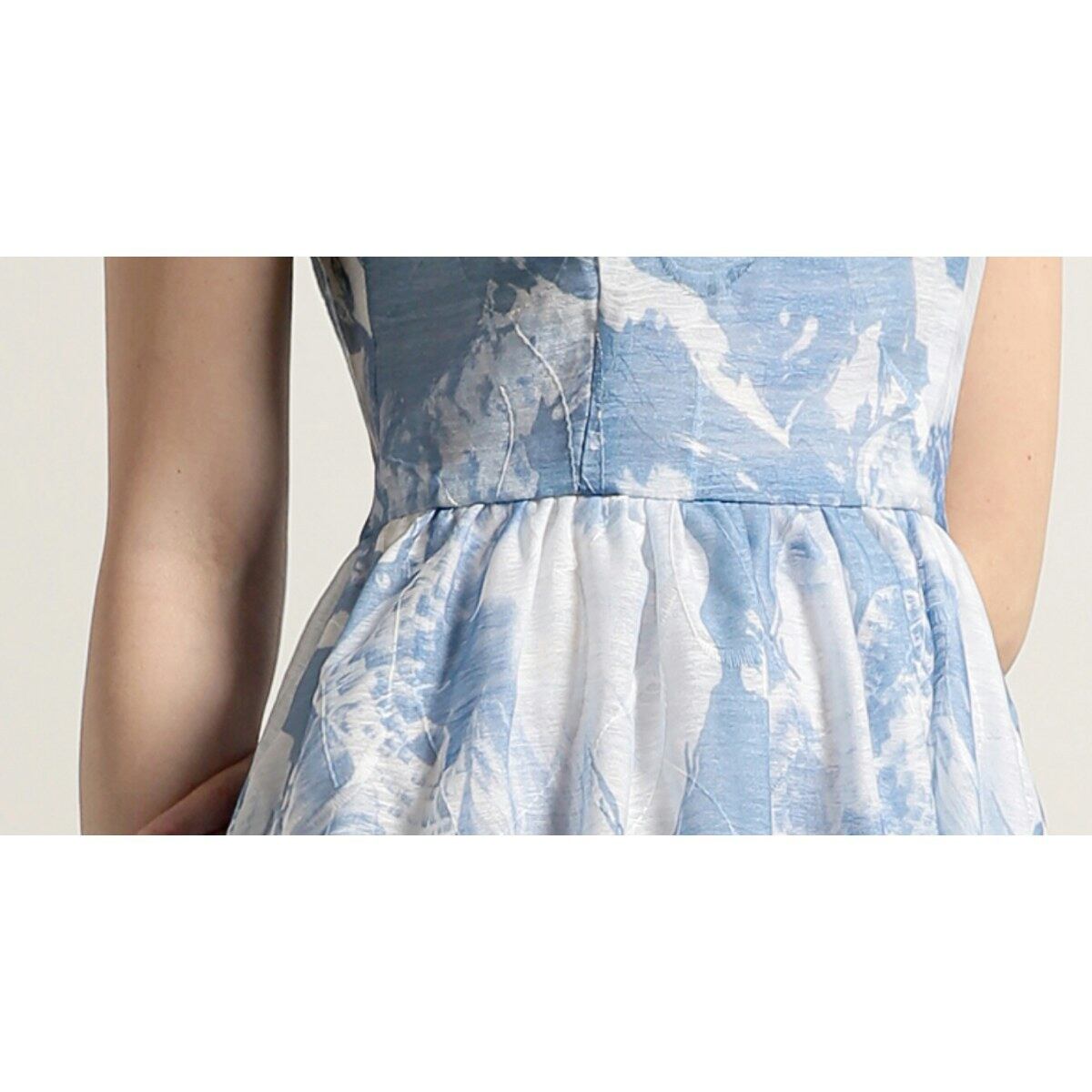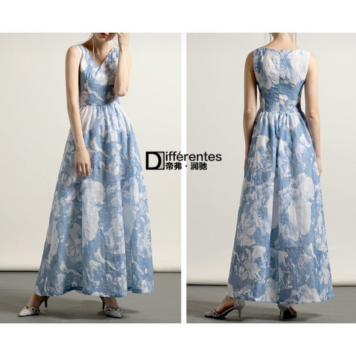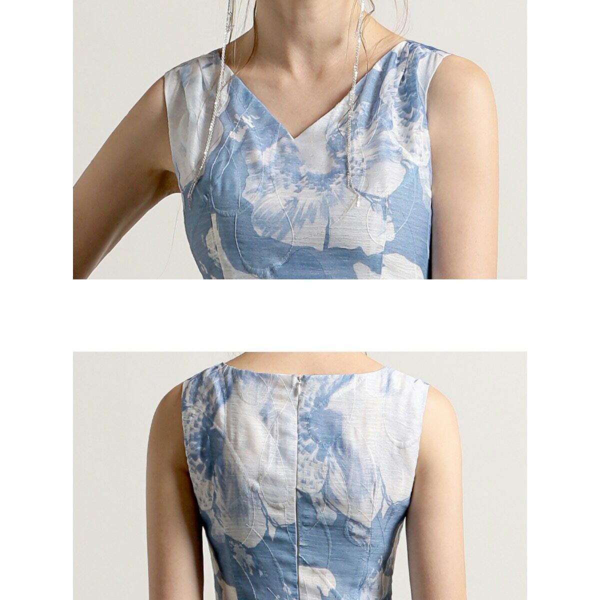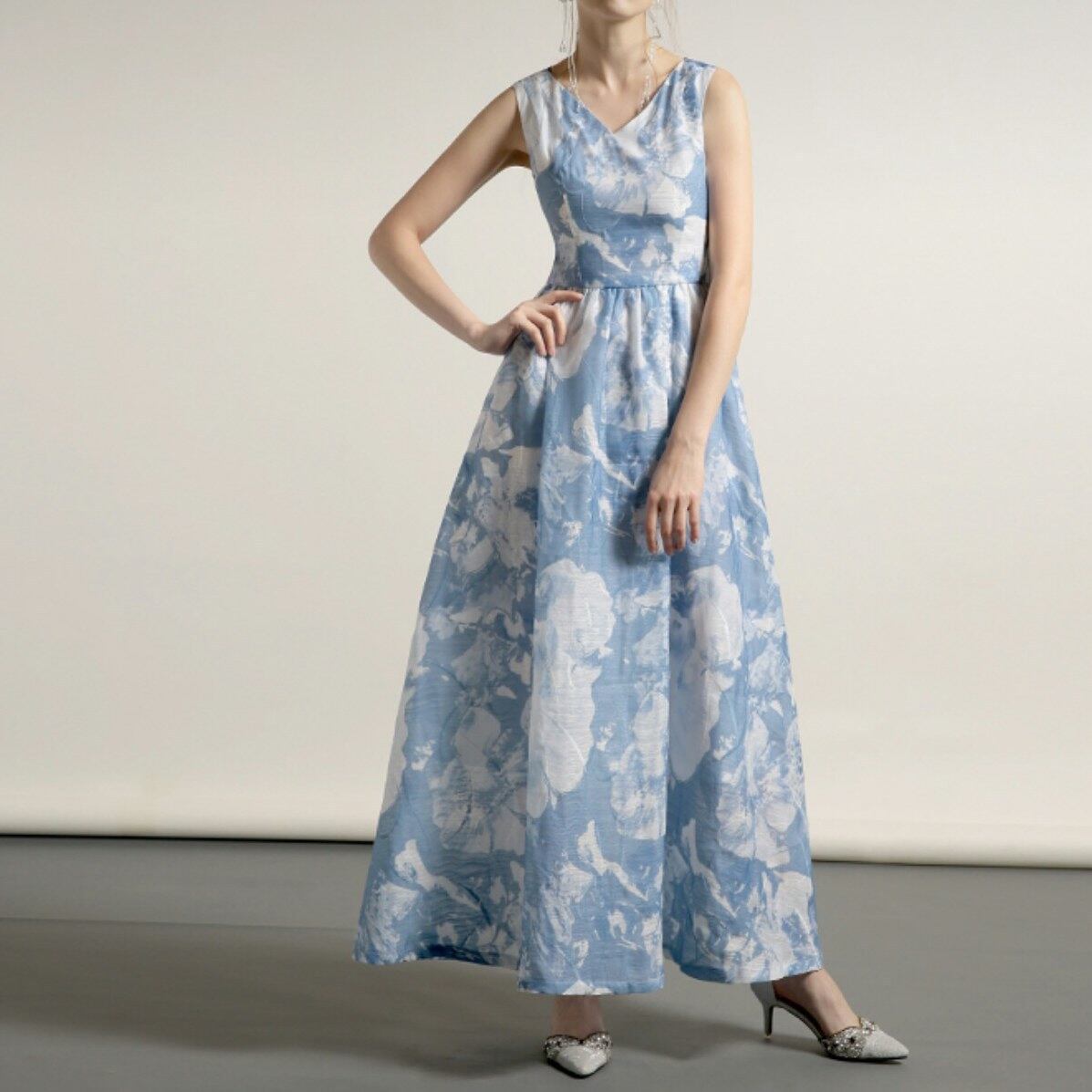 透明感ある白青ミックス模様Vネックノースリーブマキシドレス