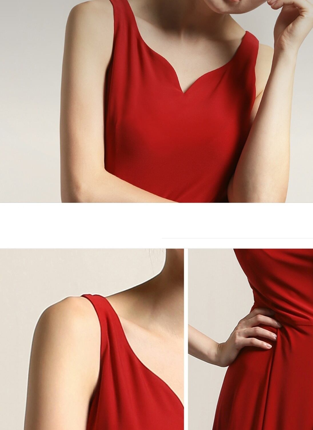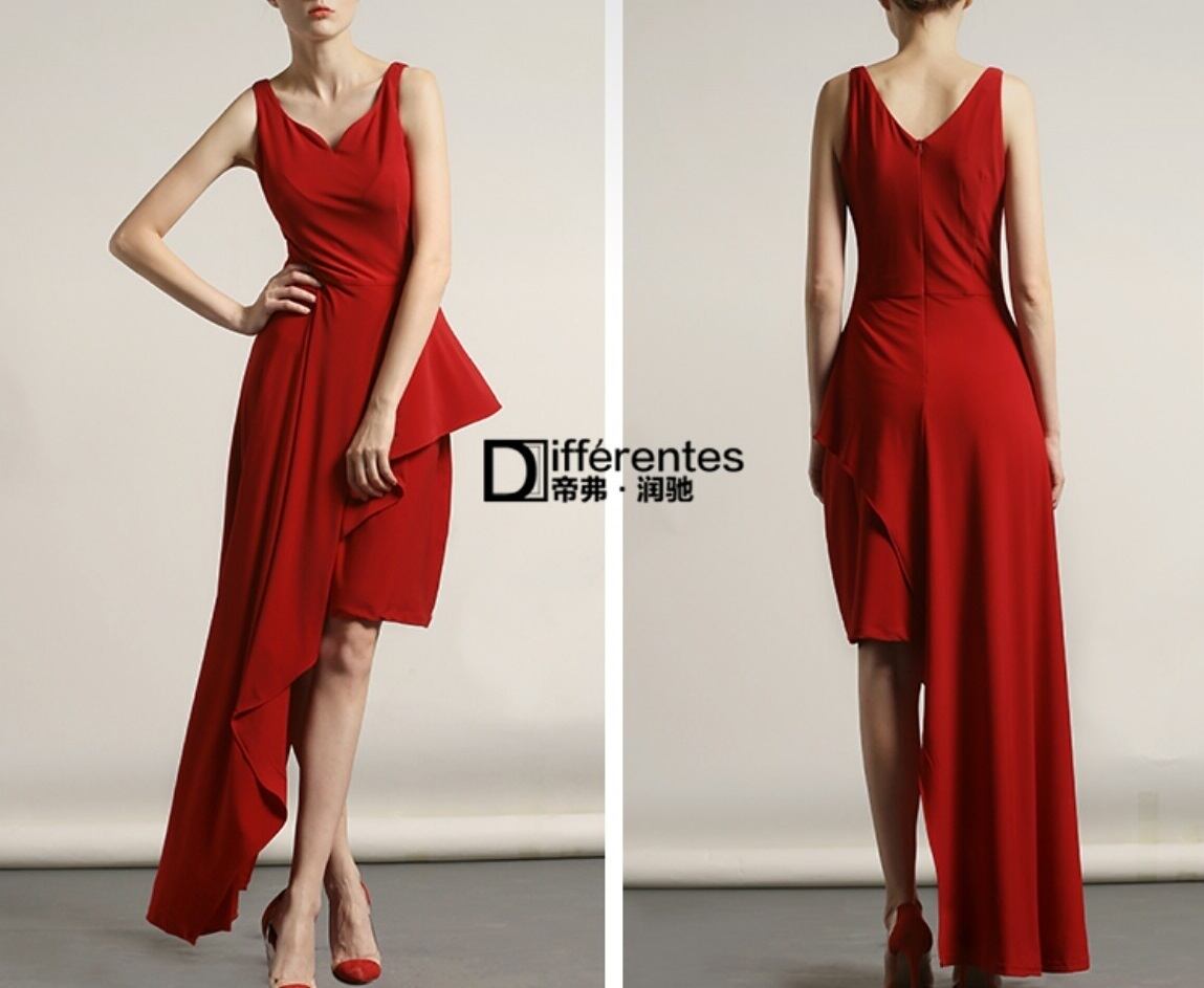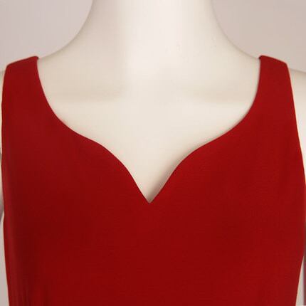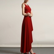 フォルムで個性を強調/赤のアシンメトリーノースリーブドレス