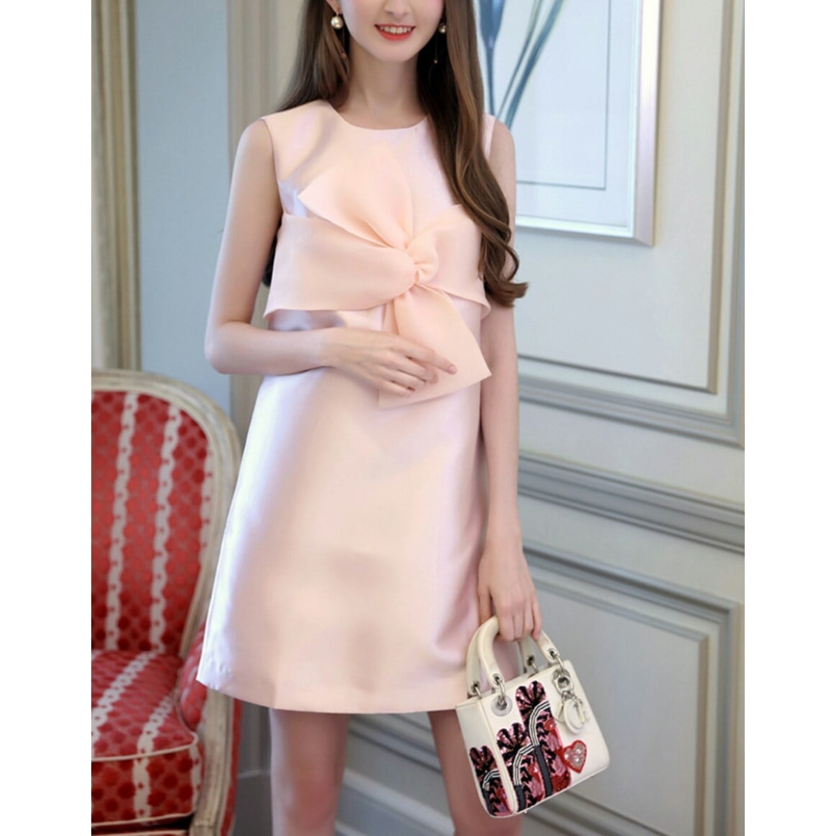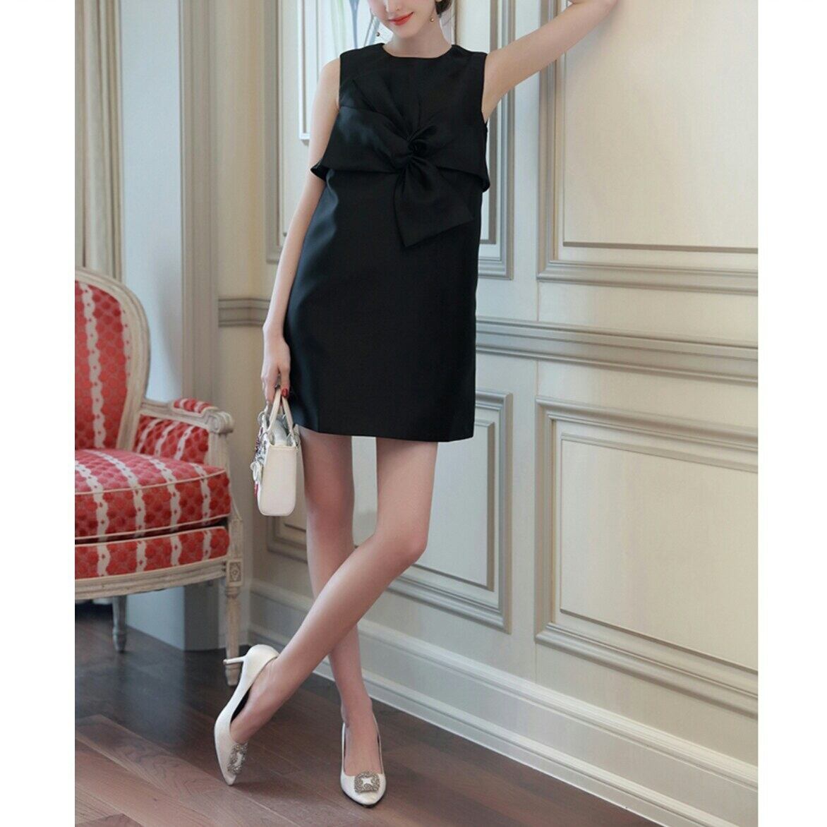 大きいリボンとAラインフォルムがかわいいノースリーブドレス