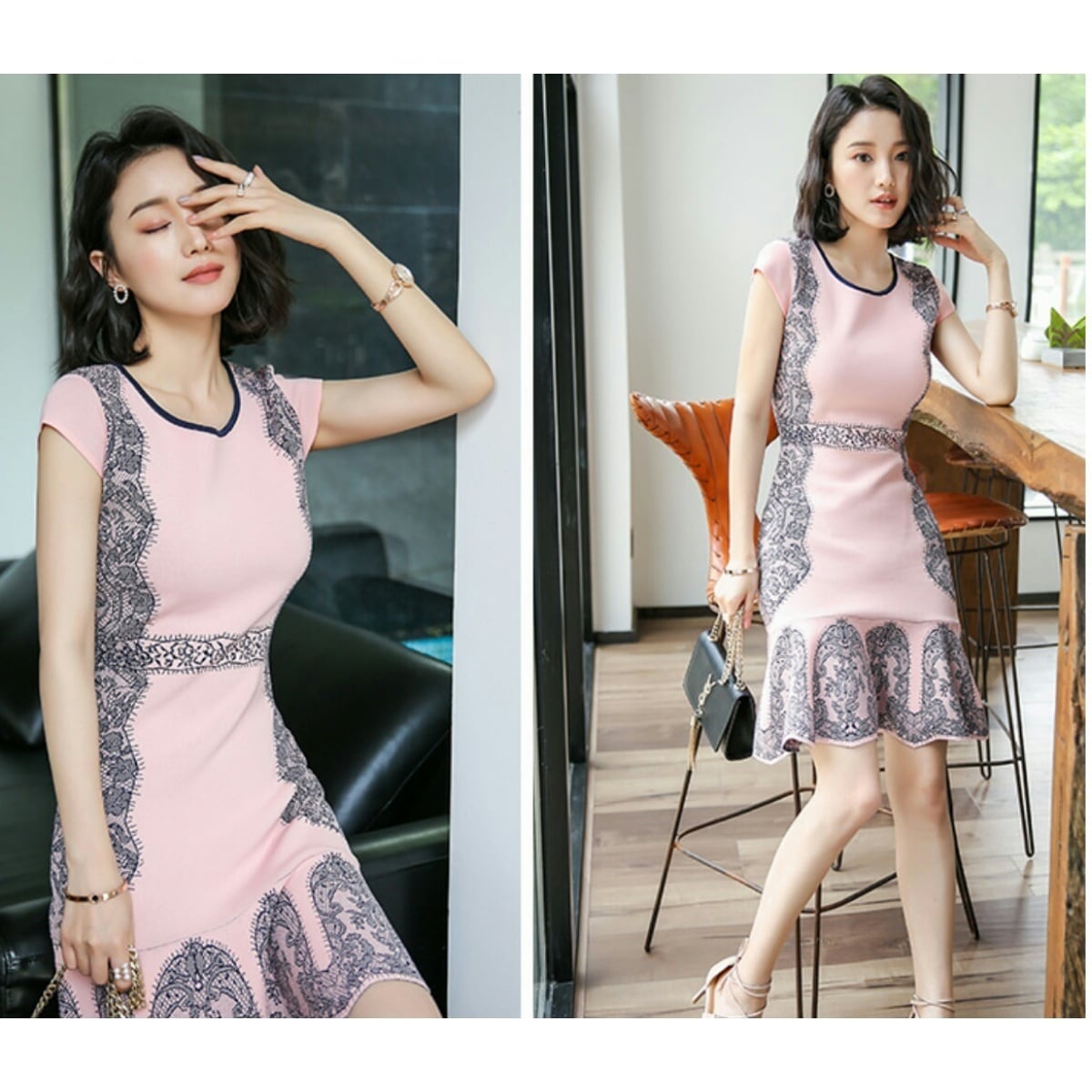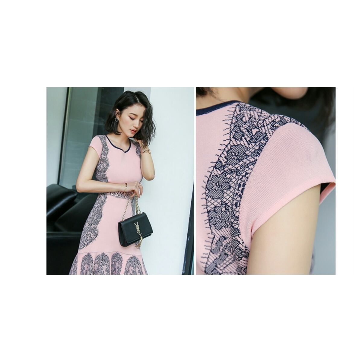 レース風な模様でメリハリ感強調ヘムラインが可愛いニットワンピ